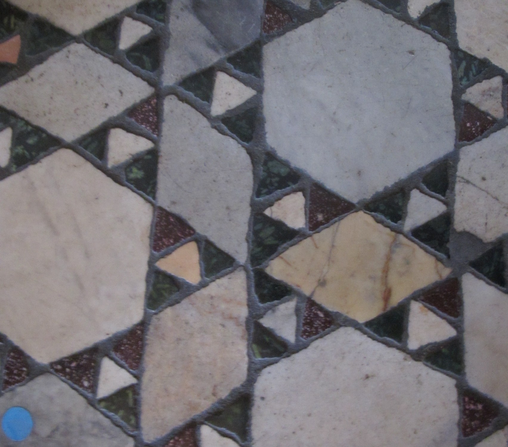 The Cosmati work is named after a single family — the Cosma – Romans who for generations (in the 12th and 13th centuries) made these intricate geometric floors of cut stones such as red porphyry, green serpentine, and various white and colored marbles. Glass paste was also used, and the materials were cut into triangles, squares, and circles that formed incredibly complex patterns.