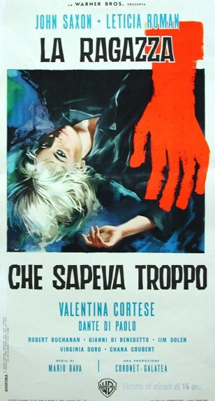 The Girl Who Knew Too Much (in Italian, La ragazza che sapeva troppo) (1963) – is a prime example of the giallo film genre (giallo means yellow, which refers to the color of the cheap paperback crime/thriller novels that started the genre, similar to film noir). This movie was directed by Mario Bava (you may recognize the name from my last post — he directed the second movie I worked in), and starred John Saxon, who you’d recognize from over 200 horror and action films, in particular spaghetti westerns. The story follows a young woman named Nora who witnesses a murder in Rome, right on the Spanish Steps. The problem is, she’s been hit on the head, there’s no corpse, and therefore no one believes her. More murders follow, tied to a serial murderer known as the “Alphabet Killer.” There’s a surprise ending, and Nora finds love with a doctor. I happen to really like the style of the film, although the identity of the murderer is a bit far fetched.