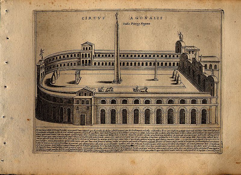 You probably know today’s Piazza Navona for its beautiful fountains, the crown jewel being Bernini’s Fountain of the Four Rivers, and the lively feeling of this gracious space, filled with vendors as well as people enjoying a stroll, both locals and visitors alike. You may even know it retains the distinctive oval shape of what it one was — a race track built by the Emperor Domitian.