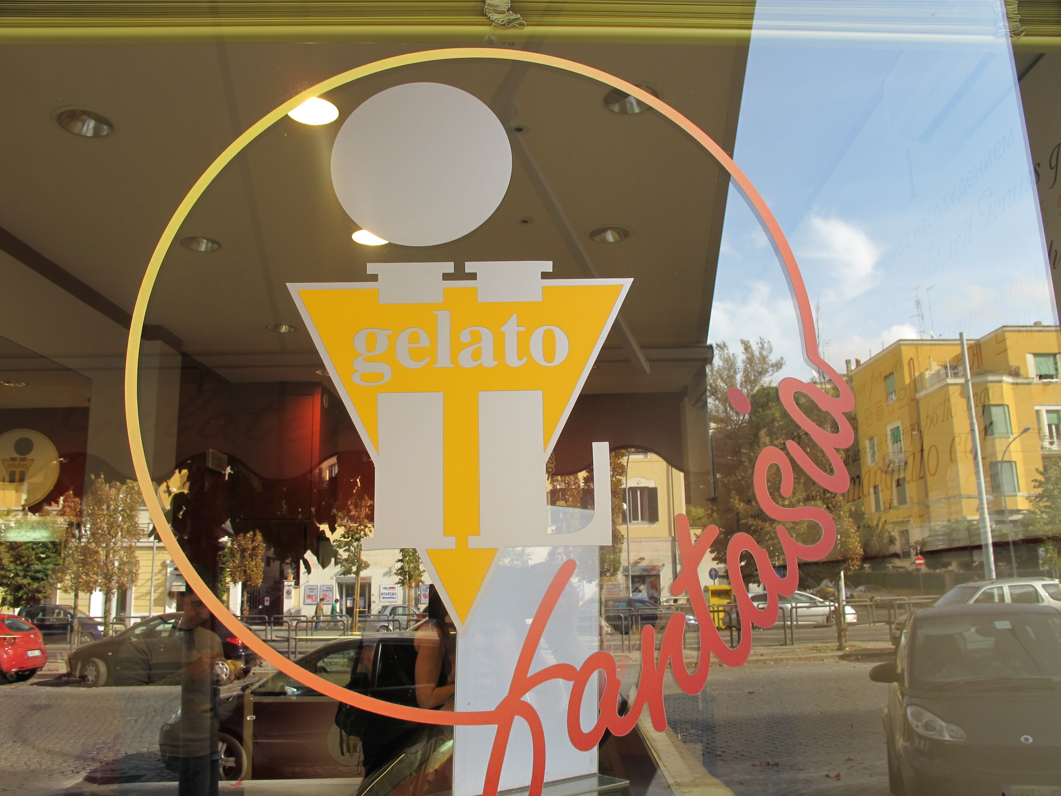 … we went to Il Gelato di Claudio Torcè, with a branch at Viale Aventino 59, near Circus Maximus (take metro to Circo Massimo and walk south down the street toward Testaccio), look for the window with the symbol on it: