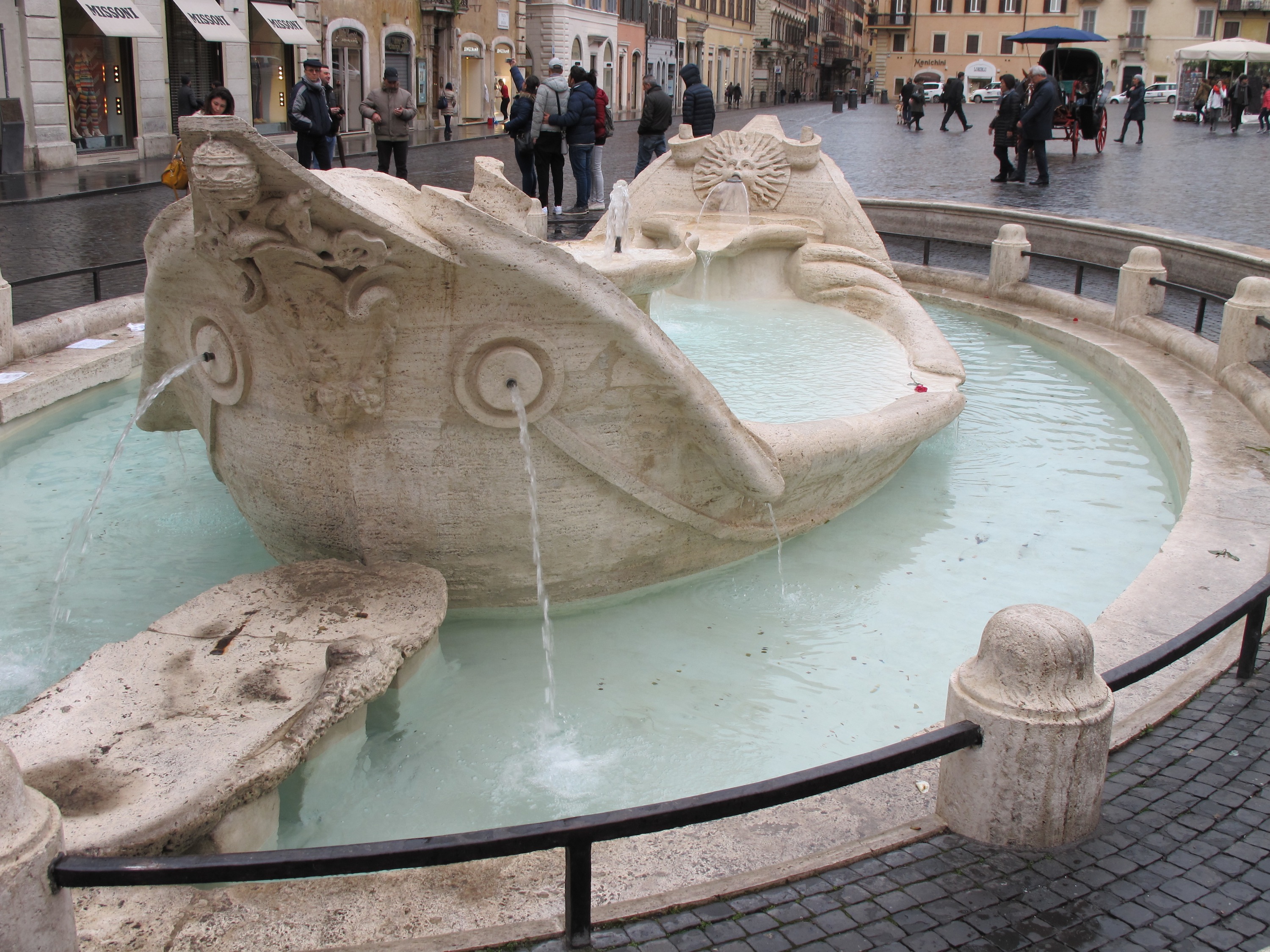 One of Rome’s greatest artists, Gian Lorenzo Bernini, was quite familiar with our little neighborhood, as I mentioned in our very first blog post, A Few Stories from Via della Mercede. Indeed, he was working in our neighborhood as a young man, when in 1627 he and his father Pietro Bernini, built one of Rome’s most beloved fountains, the Barcaccia, which translates into something like “the old boat.” Lore has it that the Barcaccia was inspired by an old boat that had washed up into Piazza di Spagna during one of Rome’s numerous floods in 1598 — before the retaining walls were built along the Tiber. As beautiful as it is, keep in mind this fountain was built to give Romans their drinking water, so it has an important job to do.