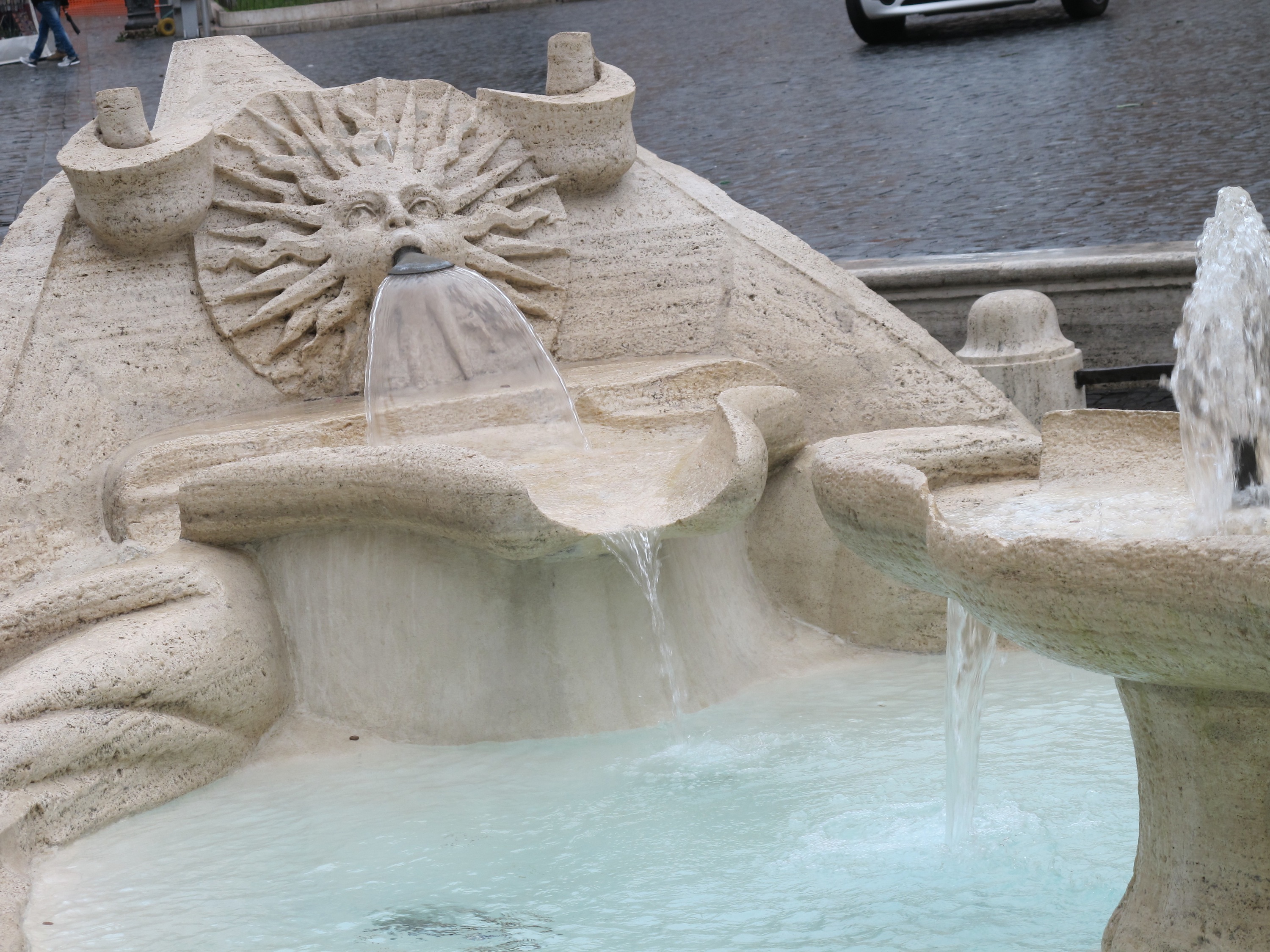 Fed by one of Rome’s great aqueducts, it sits a bit below street level to increase the water pressure (to better pump the water through the fountain). Its situation also adds to the artistic beauty as the “boat” looks as if it is sinking. Two sun faces spit water into an internal basin, which in turn flows into a larger basin — the interior of the boat, which obviously has a serious leak!