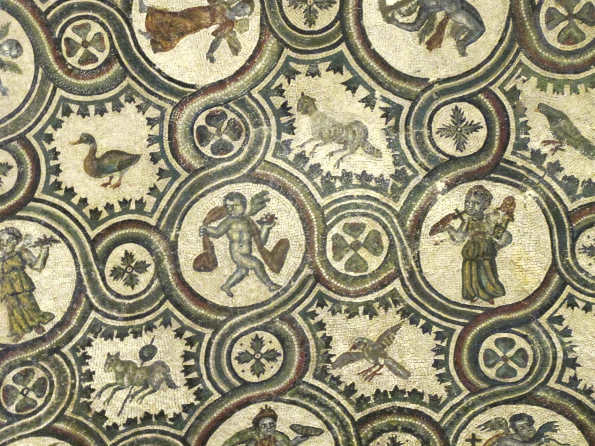 The circular, round ambulatory of Santa Costanza is completely covered with some of the most glorious early Christian mosaics you will find anywhere. Some focus on complex geometric patterns: