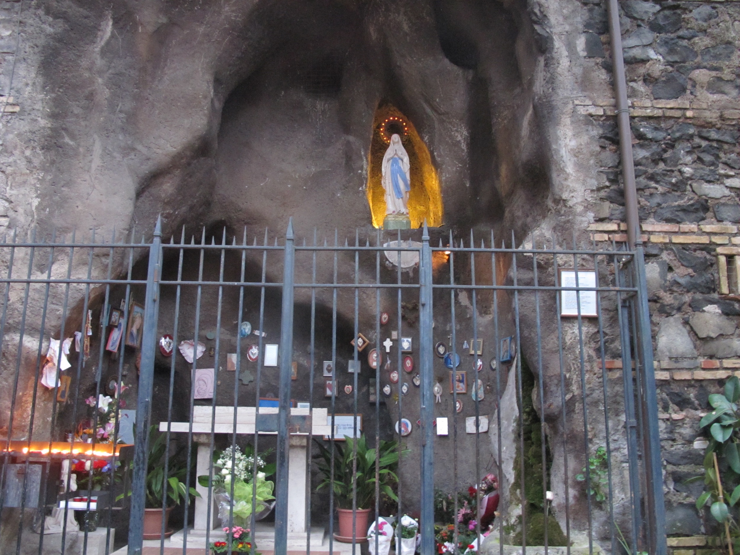 On one side is a little Marian shrine, set within a grotto.