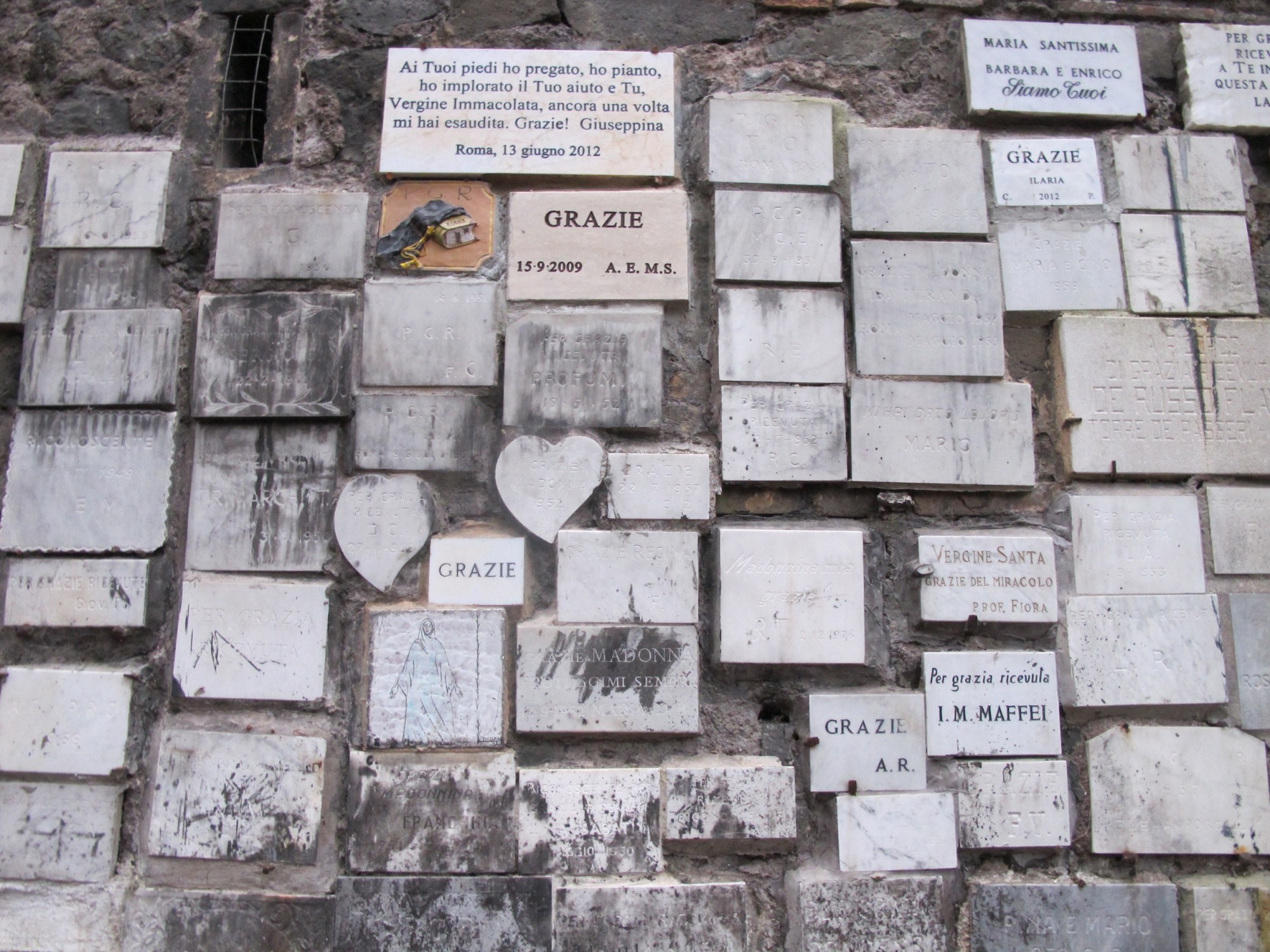 All along the walls leading to the shrine are the wonderful little ex-voto plaques (shown at the top of this post) left by grateful believers who have worshipped here and believe their prayers answered. Many of them merely say, “Grazie.”