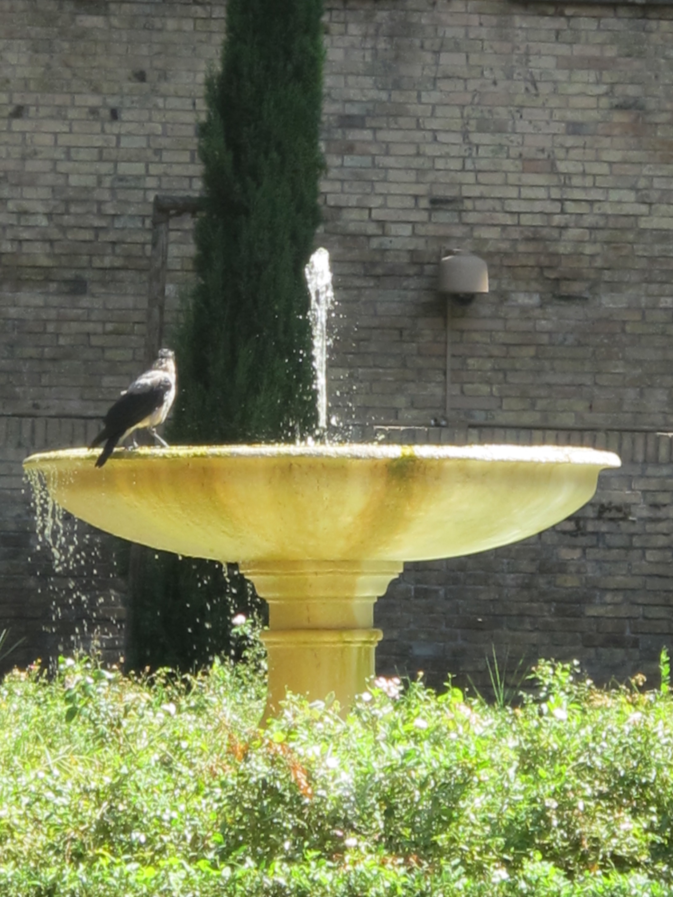 As we approached the villa on the day we visited, we first saw the gardens from the street, and there was a huge, dignified hawk taking a drink from a fountain. What a surprising sight!