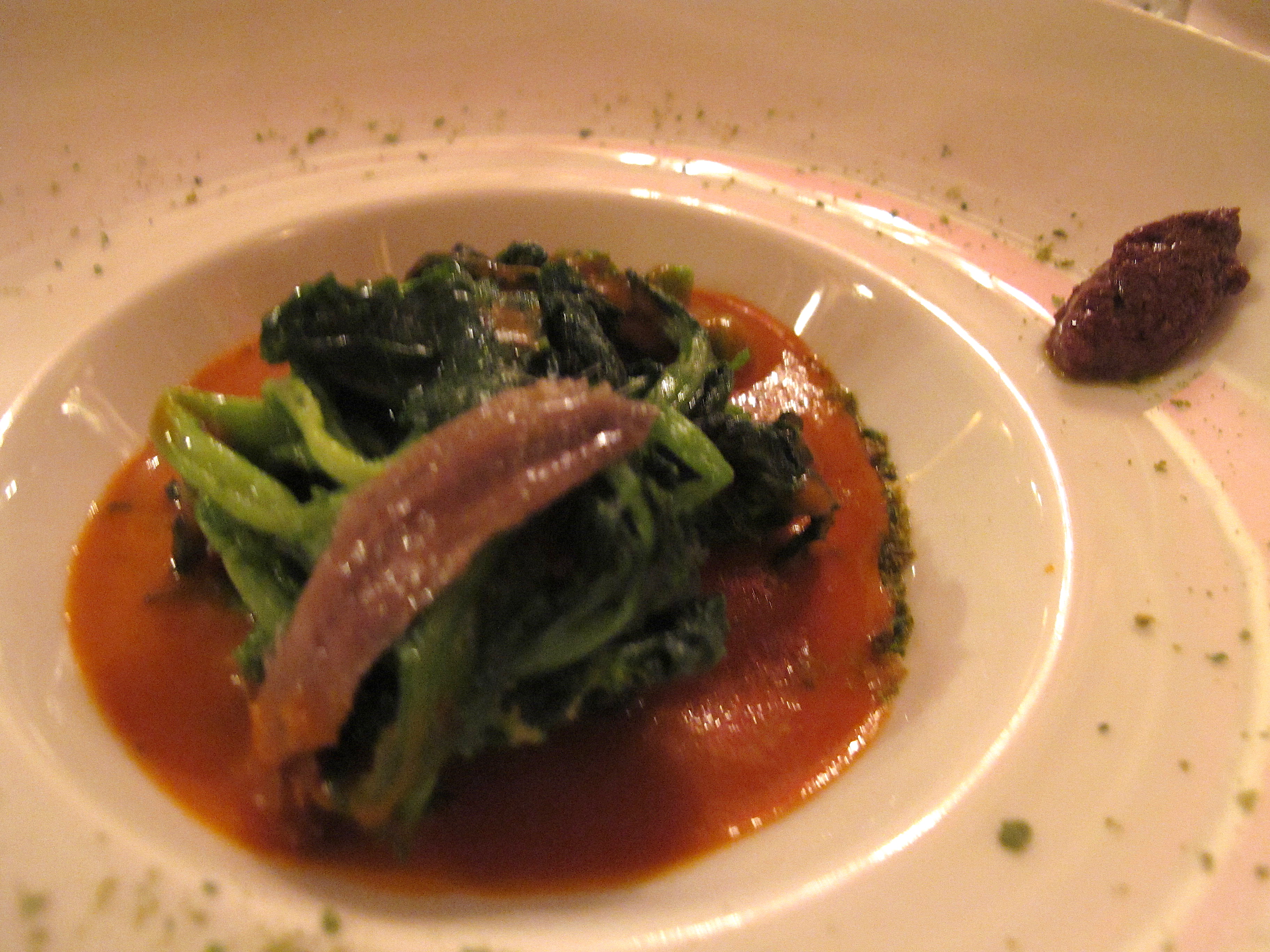 We moved on to puntarelle (a traditional, bitter Roman green that I love) with tomato and anchovy broth.