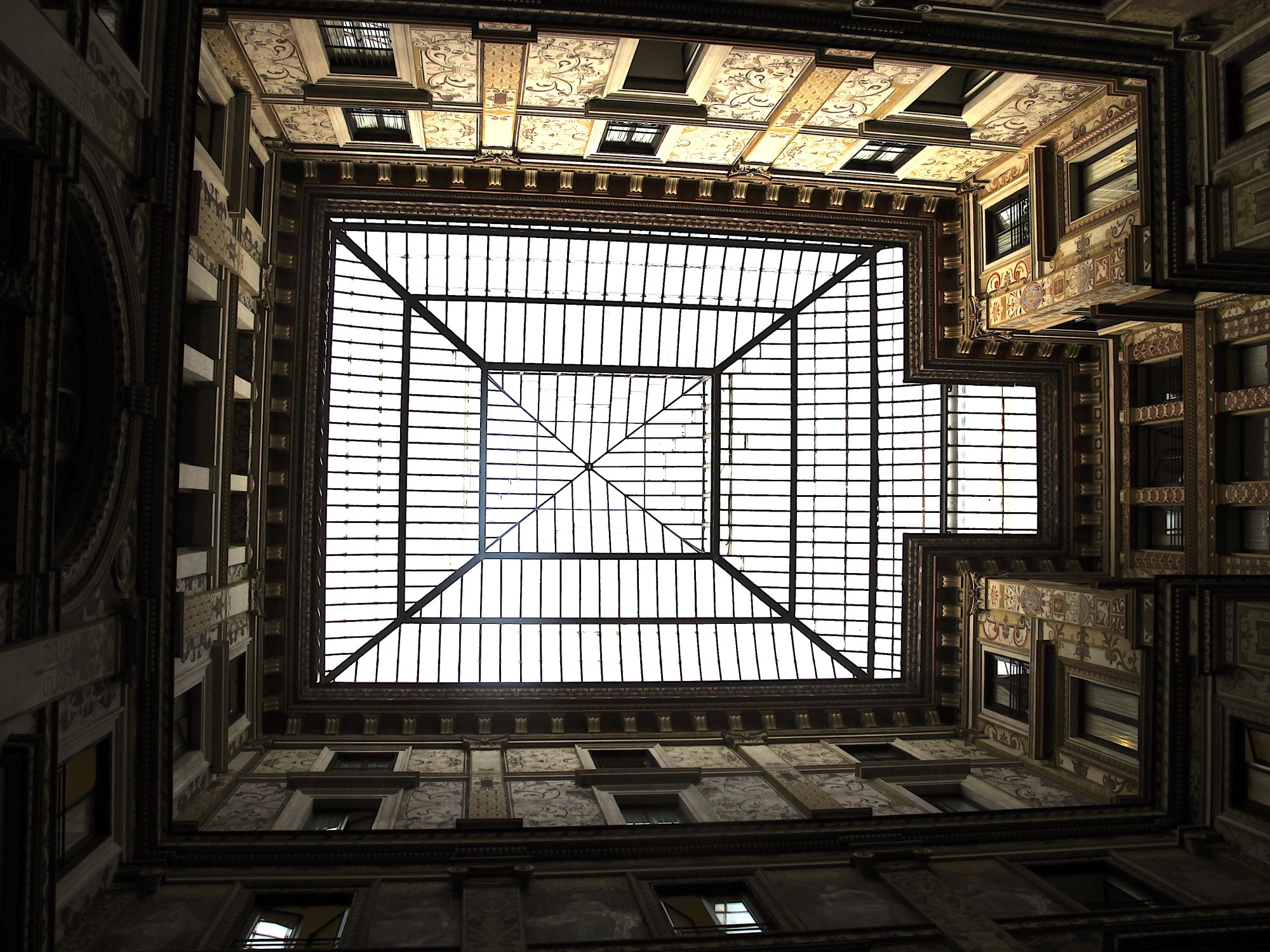 As fascinating and beautiful as ancient Rome is, “more recent” Rome can be equally stunning. One such example is not far from us — a 7-minute walk, to be specific — on Piazza dell’ Oratorio, and it’s a surprise gem. Built in the 1880’s, Galleria Sciarra is one of the few examples of Art Nouveau in Rome. One passes through the open-air courtyard of this commercial building, and you are immediately struck by the glorious glass and iron skylight (seen at the top of this post), designed by architect Giulio De Angelis for Prince Maffeo Sciarra.