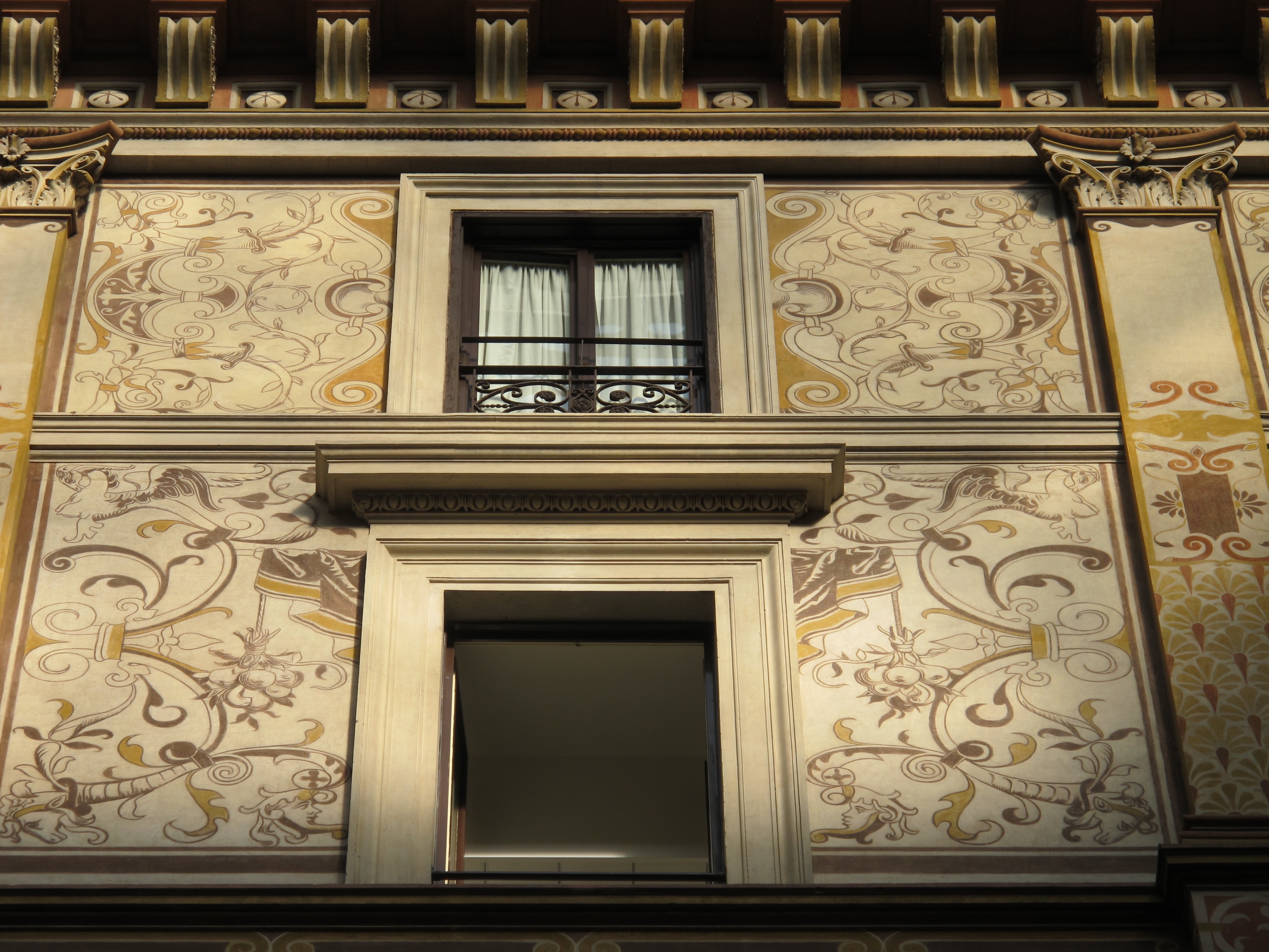 Then you notice the painted scenes by Giuseppe Cellini on 19th-century middle class womanly virtues. The building was originally a shopping arcade. The lower row of paintings show women in their various roles in 1880’s society from girl, to bride, to mother. The upper row shows personifications of female virtues such as loyalty, chastity, and patience.