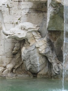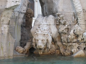 The fountain depicts personifications of the major rivers of the four continents known to Christianity at the time, along with plants and animals (some, as you will see, dubiously depicted) from those continents. The Danube, representing Europe, twists around, his arms gesturing to the coat of papal arms above.