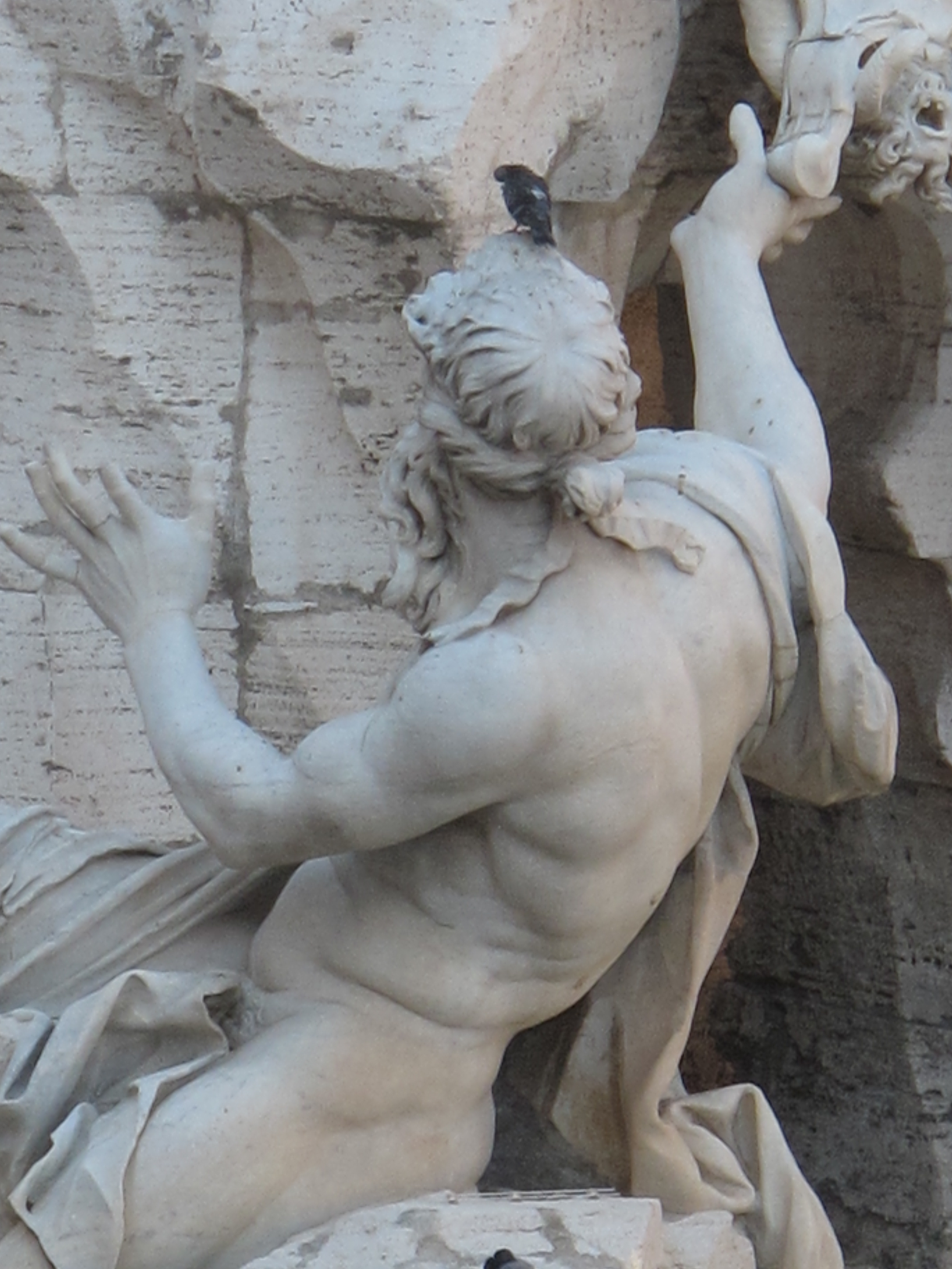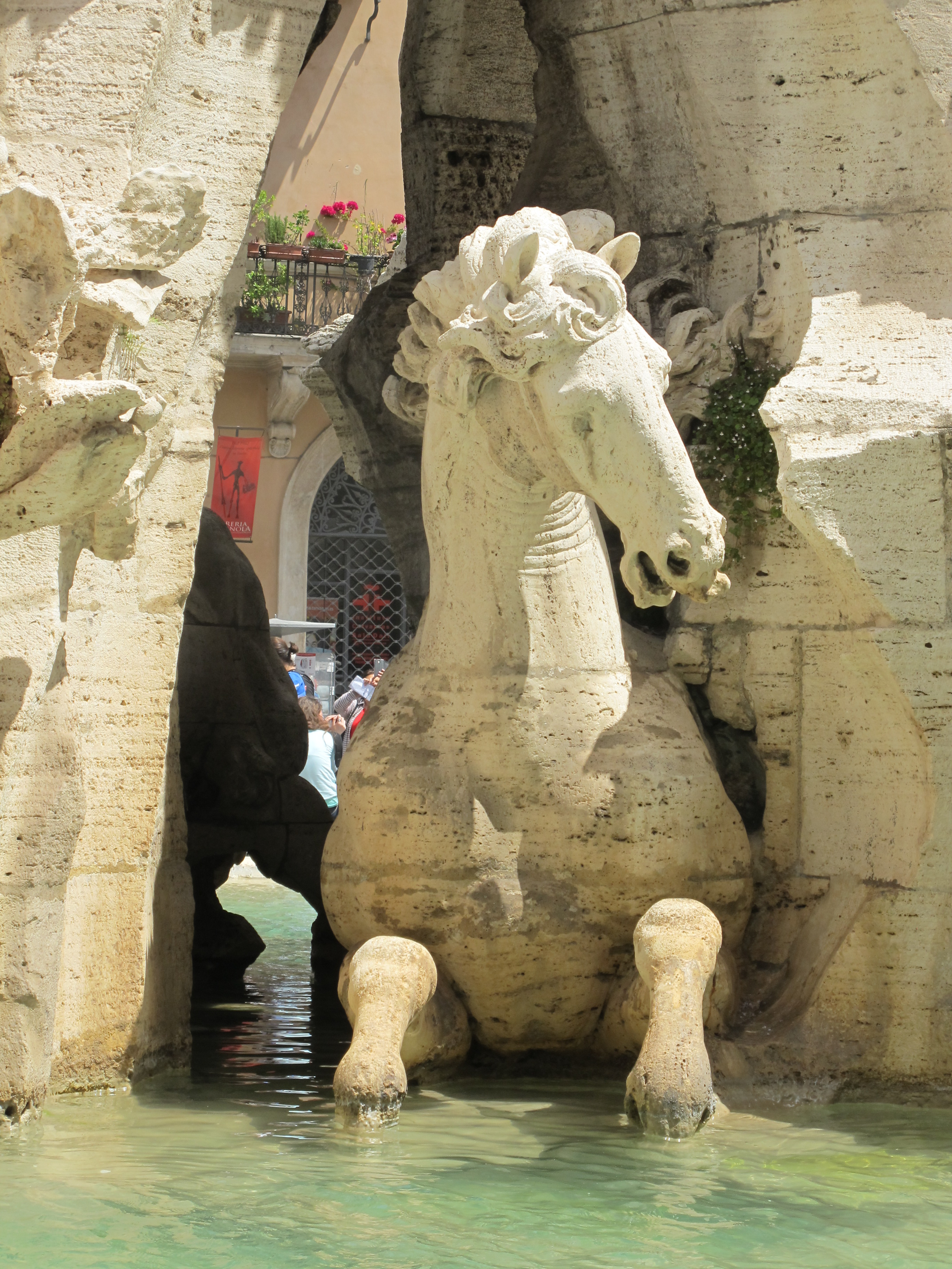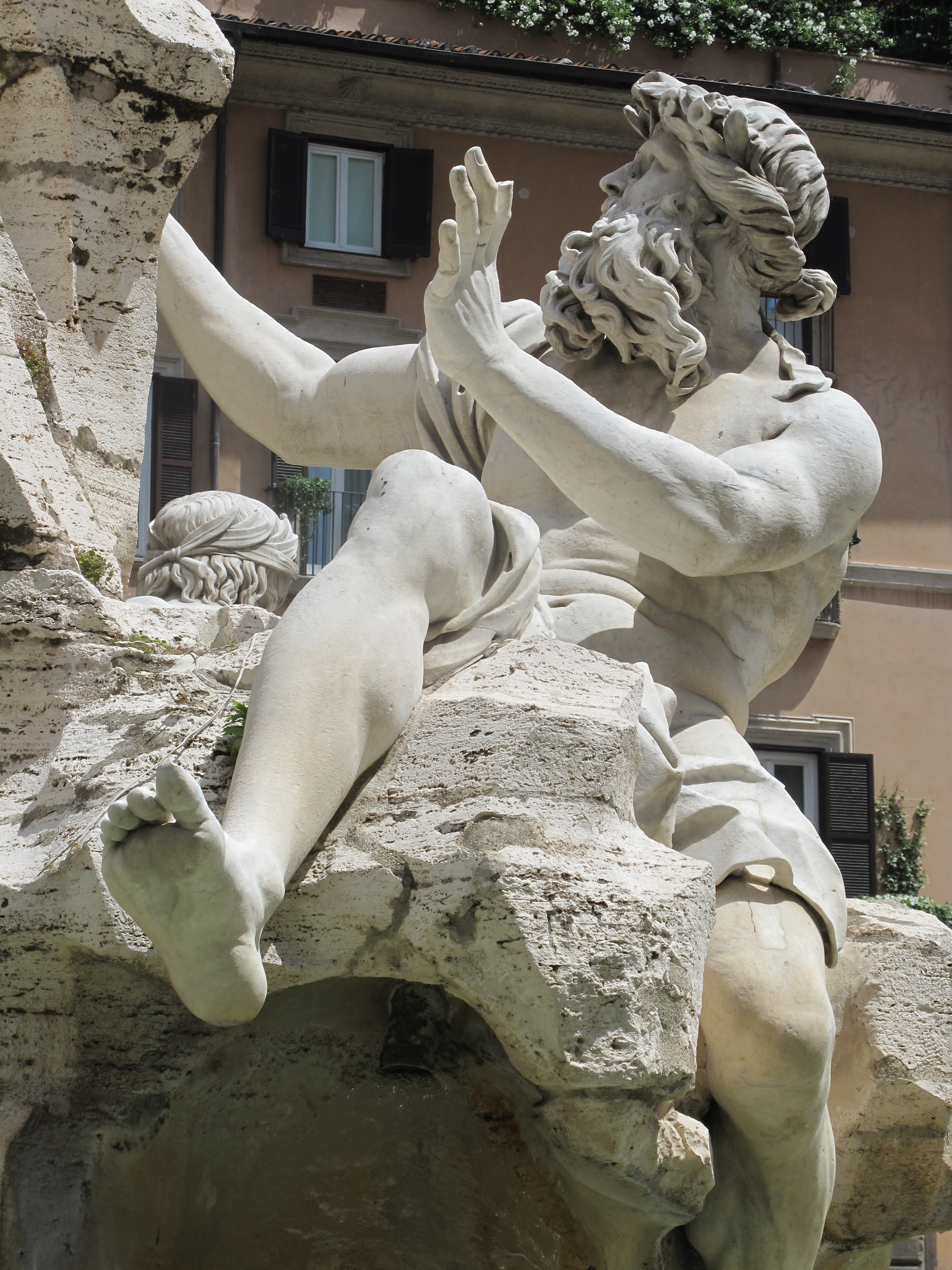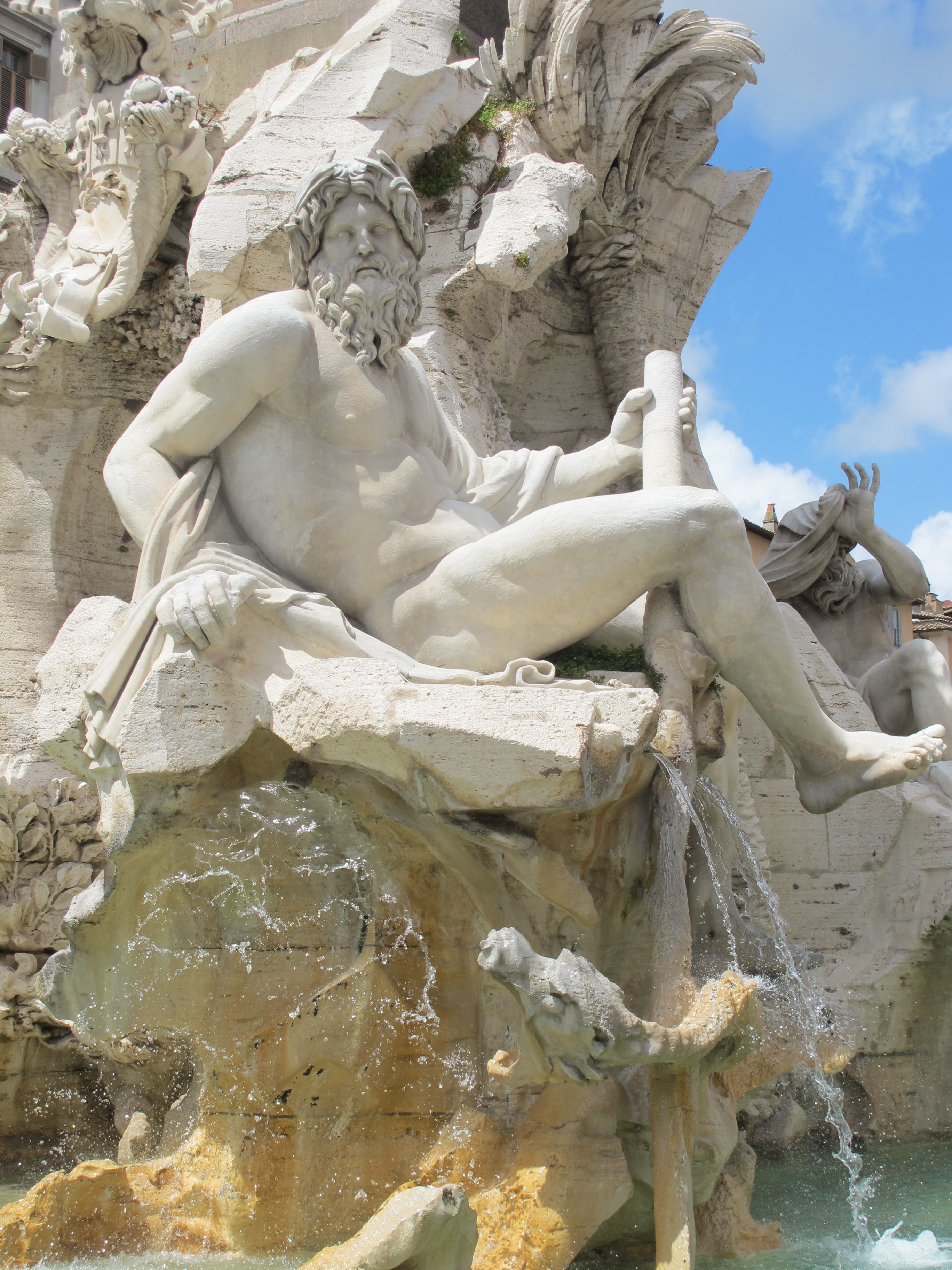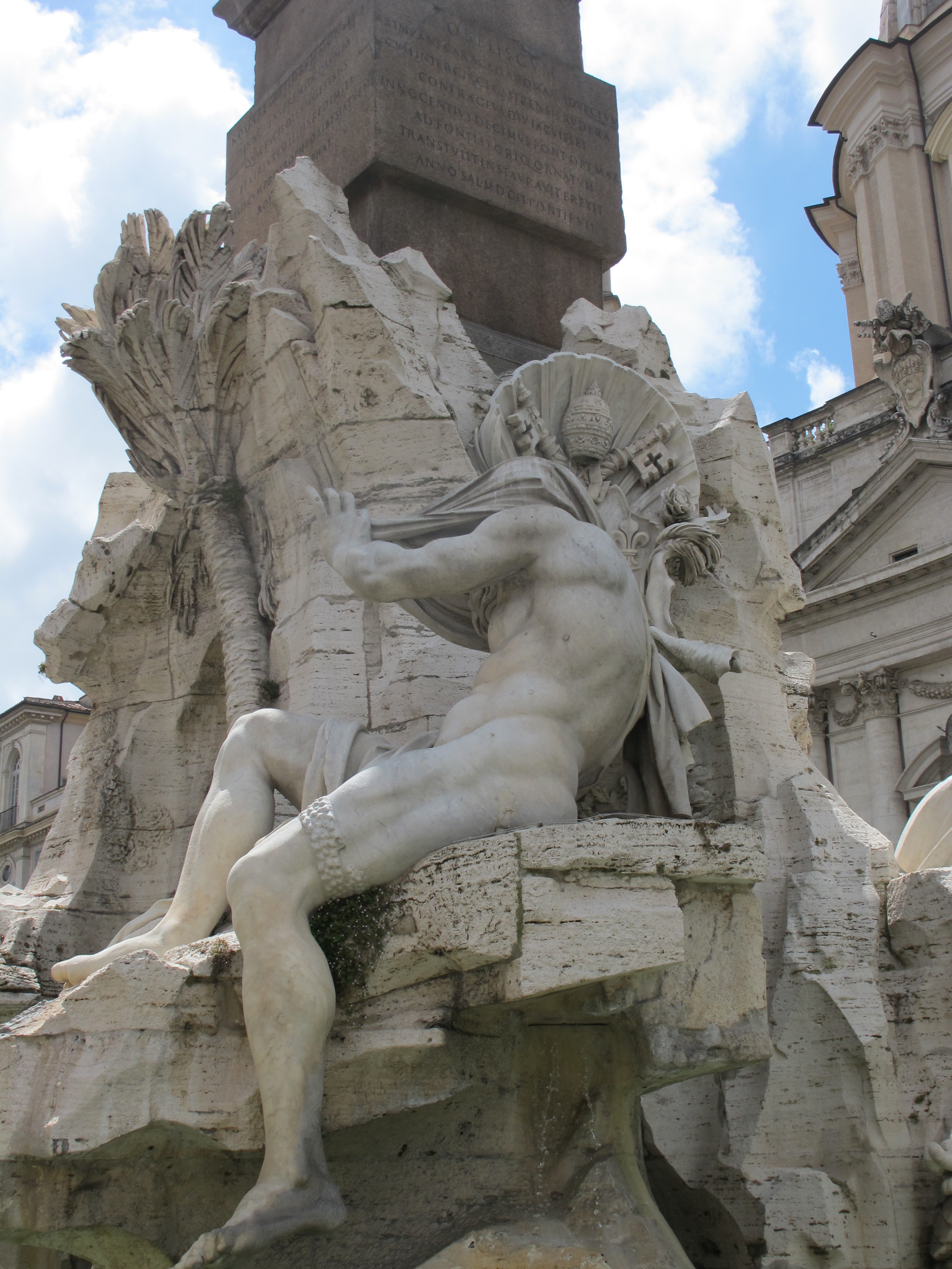 The fountain depicts personifications of the major rivers of the four continents known to Christianity at the time, along with plants and animals (some, as you will see, dubiously depicted) from those continents. The Danube, representing Europe, twists around, his arms gesturing to the coat of papal arms above.