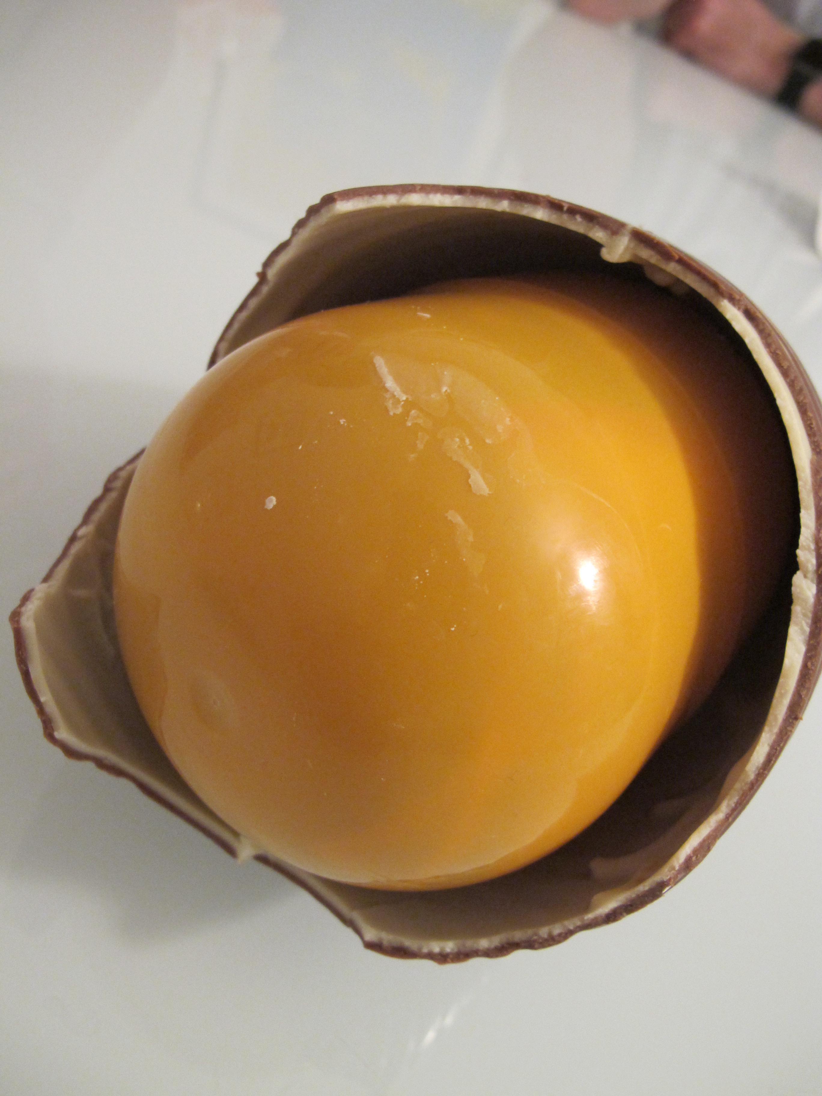 This was, however, their super-sized Easter version. The egg was in a gaudy, shiny Kinder Egg wrapping. Upon cracking the egg open, we found a giant egg yolk-colored plastic capsule.
