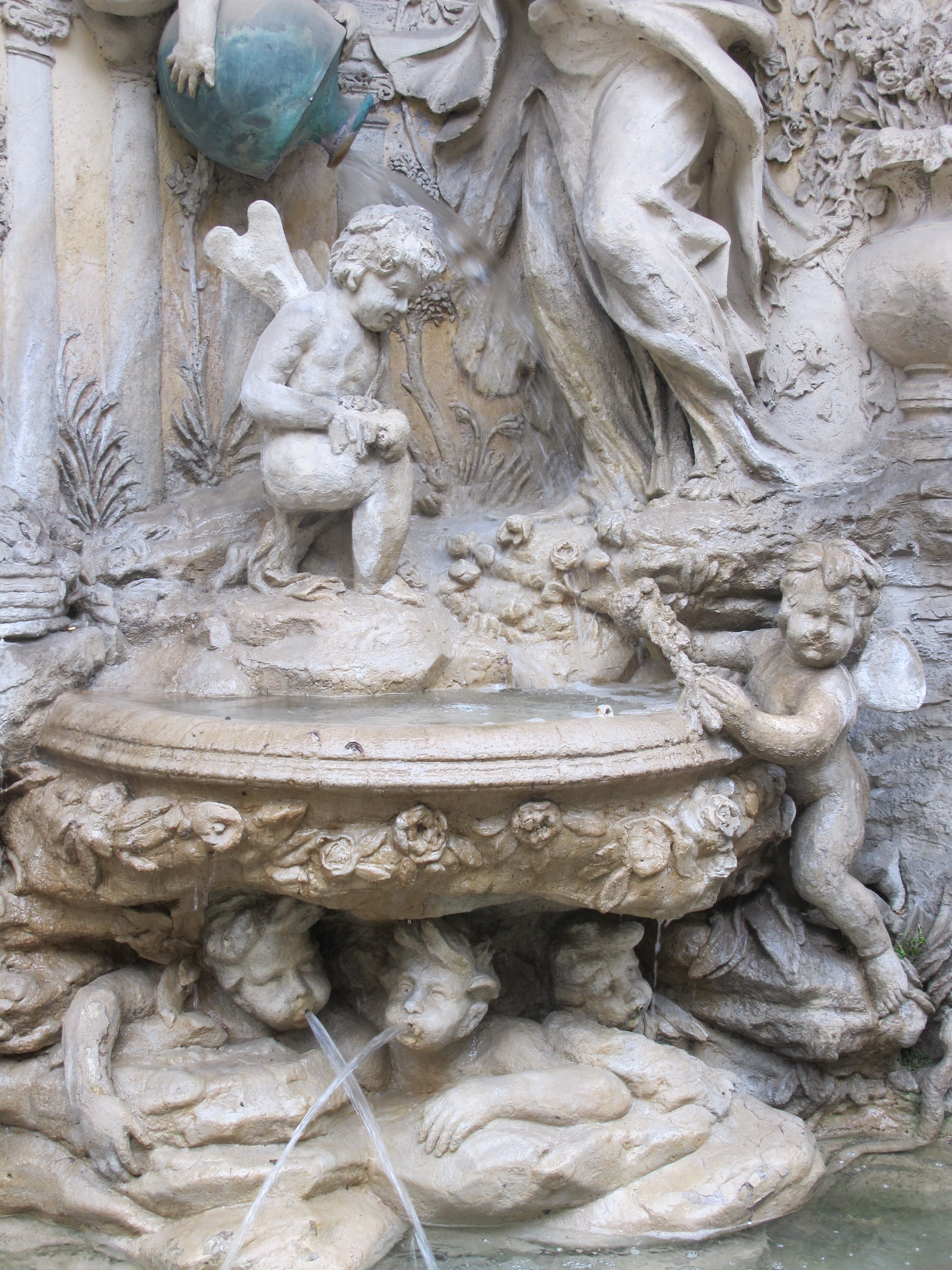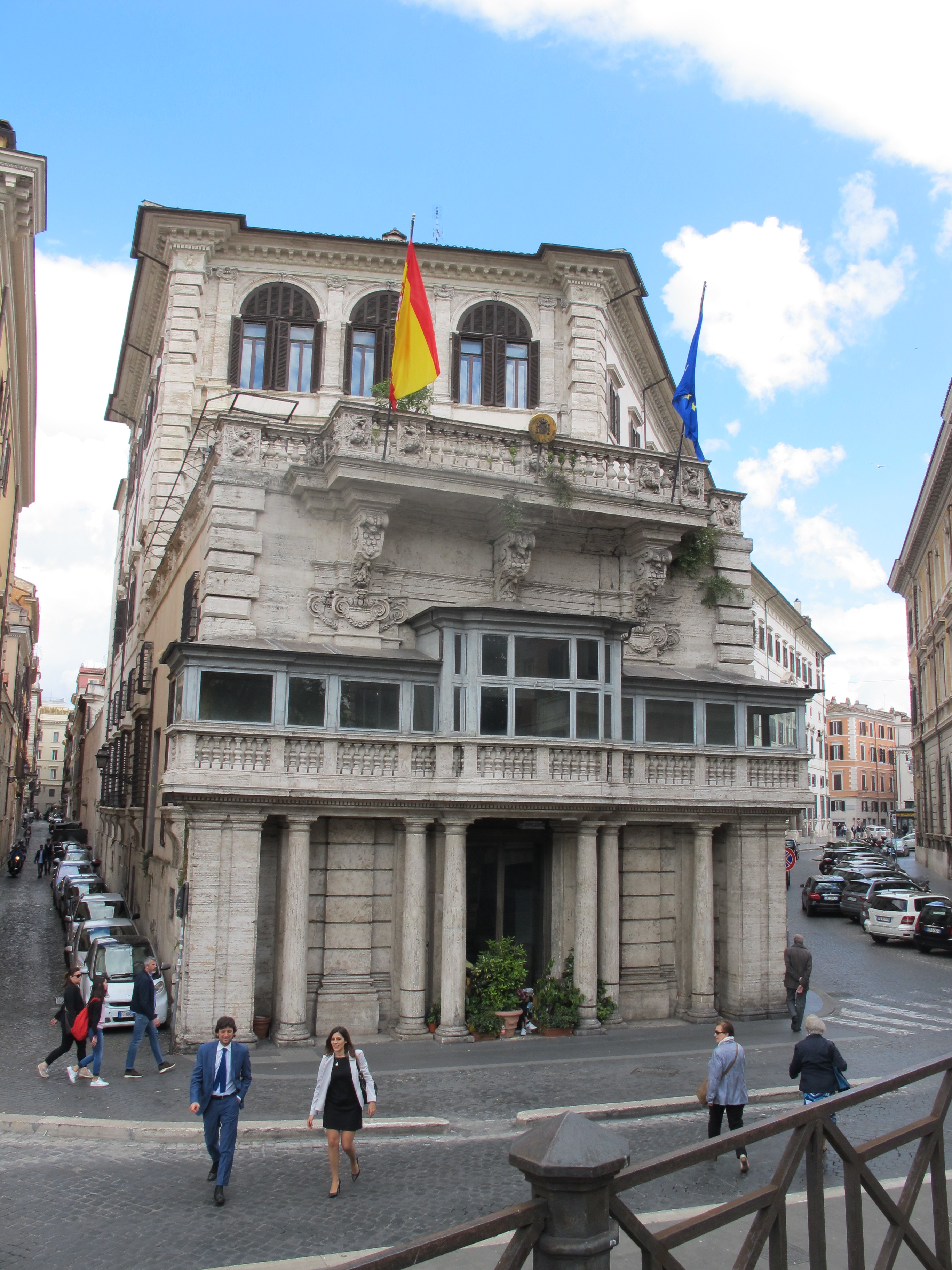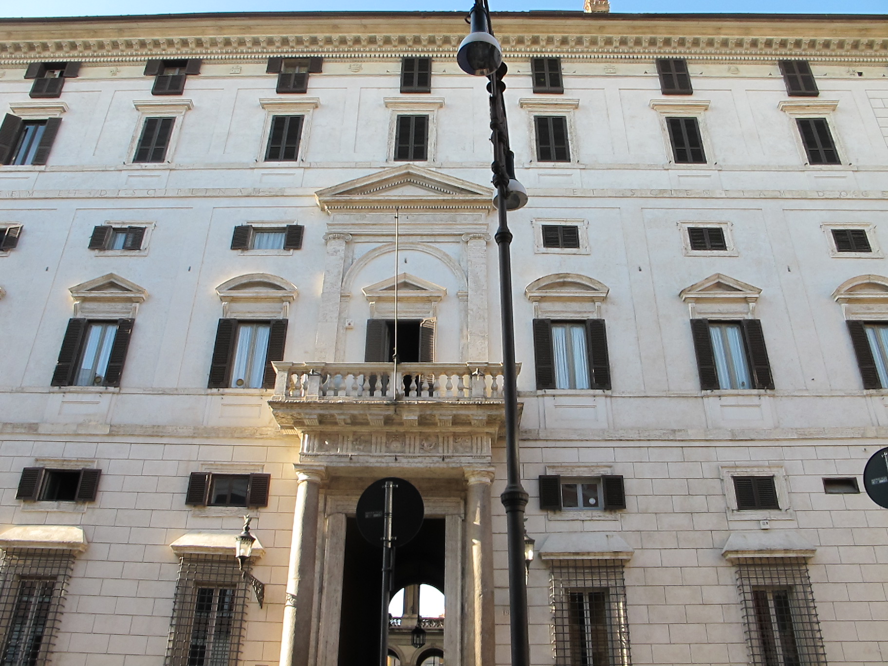 Palazzo Borghese is a few minutes walk from us, heading toward the river. Palazzo Borghese has two very different looking — and differently sized — facades. The one closest to the Tiber is very small, and a bit skewed: