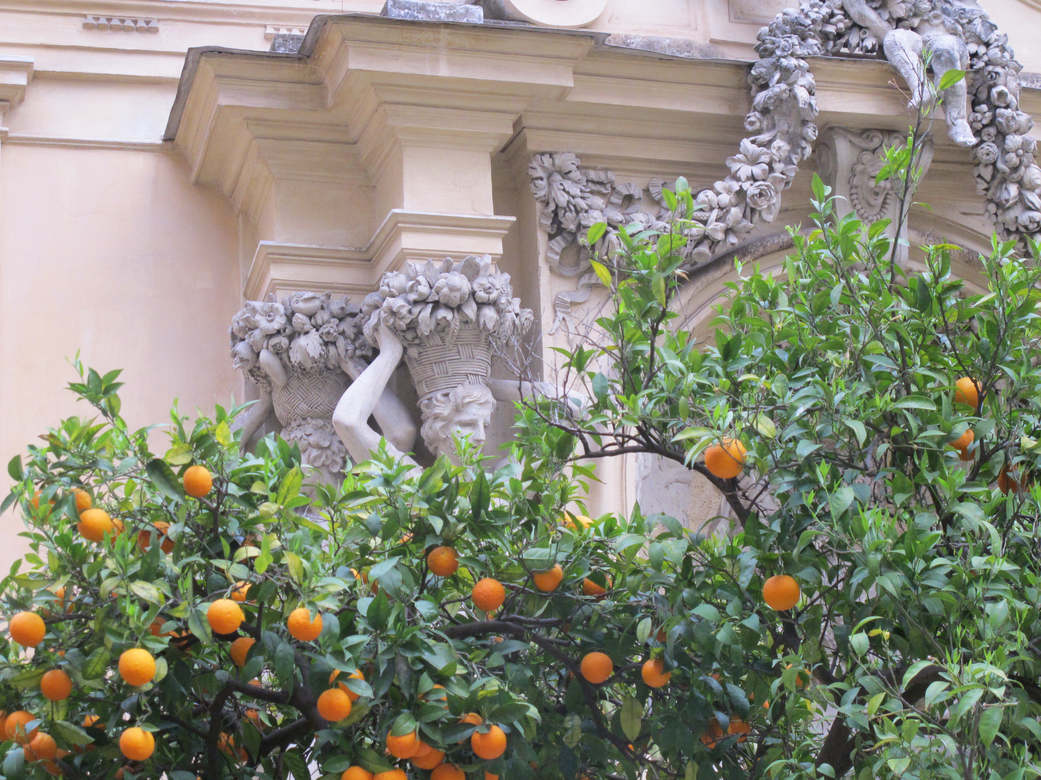 We walked through the courtyard (past a very pretty silver Ferrari) into a garden filled with orange trees and elaborate fountains,