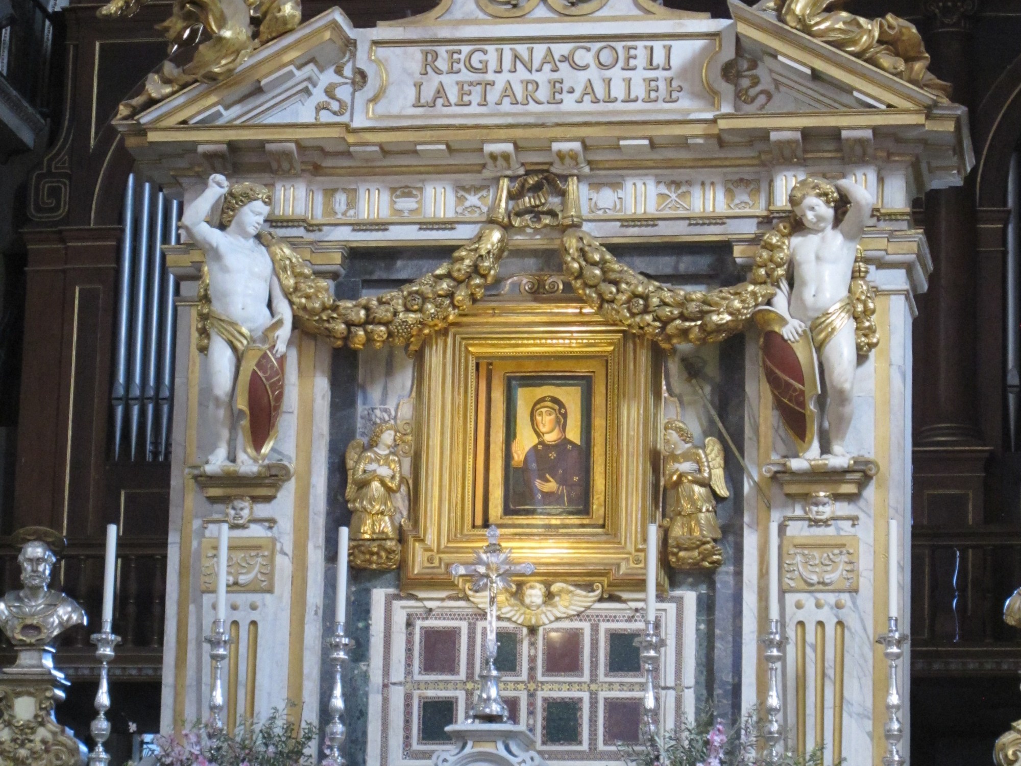 I hadn’t been to Santa Maria in Aracoeli (St. Mary of the Altar of Heaven) in a long time, but recently found myself next door, admiring the Capitoline wolf (aka the She-wolf of Rome). Thankfully my wife Laura recalled the easy, back-door entrance to the church from the Capitoline, versus huffing and puffing down the Capitoline stairs and then up again using the very intimidating stairs leading to the church.