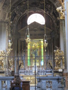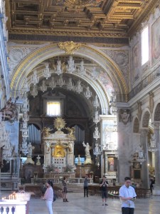 Santa Maria in Aracoeli, dating from the 12th Century, was a very important church in the Middle Ages. Today, it is a bit of a hodgepodge inside. It feels like each generation had to add something, including the many crystal chandeliers, framing the ornate altar.