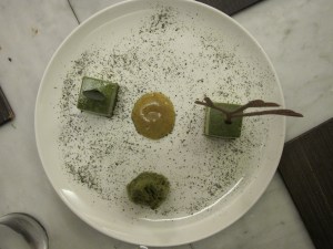 “Purple,” made of purple potatoes, blackberry, mascarpone cheese, blueberry, and grapes was the most imaginative. It tasted much like sweet potatoes, punctuated by a purple meringue and a delicious fruity sauce.