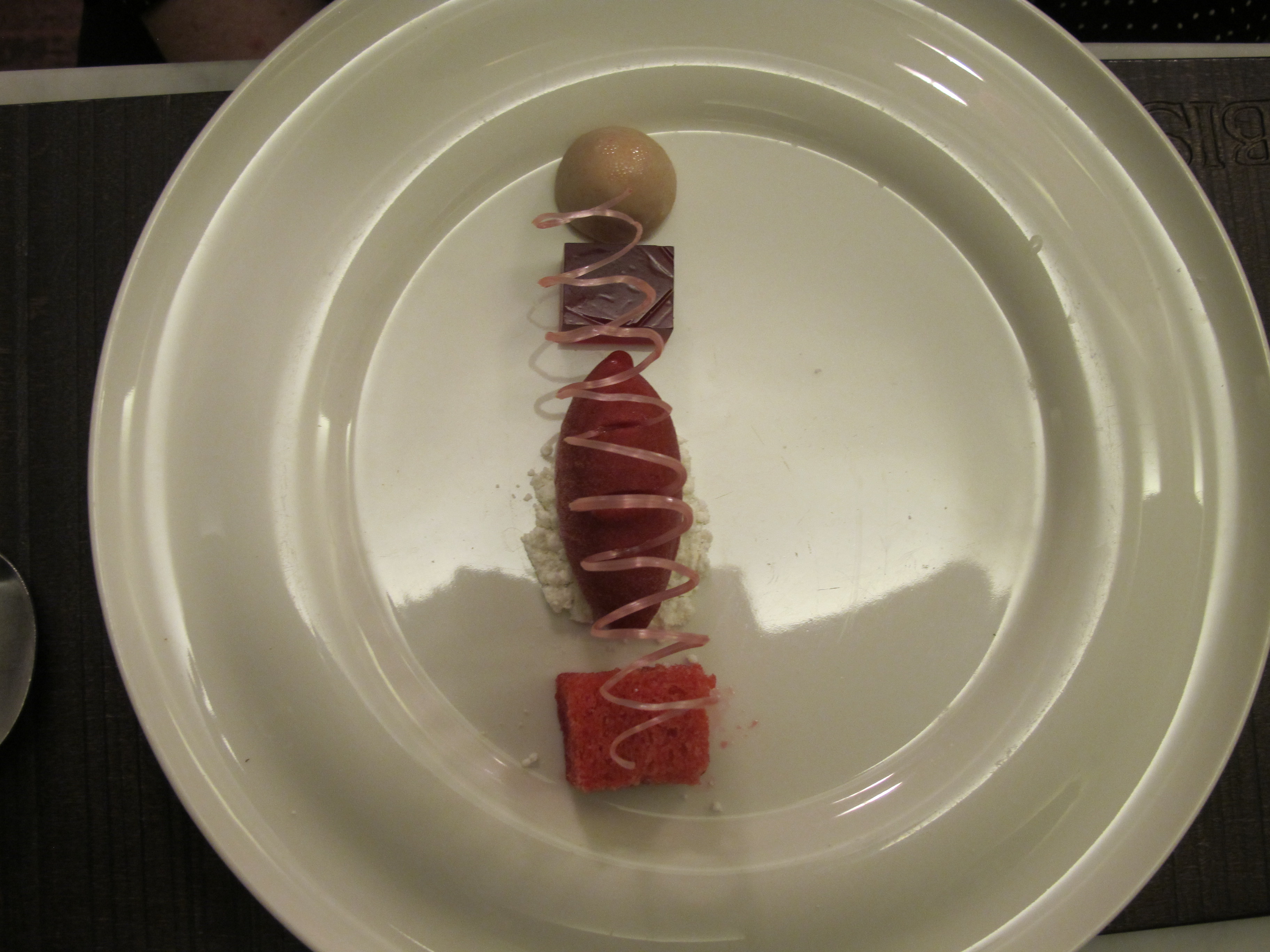 “Purple,” made of purple potatoes, blackberry, mascarpone cheese, blueberry, and grapes was the most imaginative. It tasted much like sweet potatoes, punctuated by a purple meringue and a delicious fruity sauce.