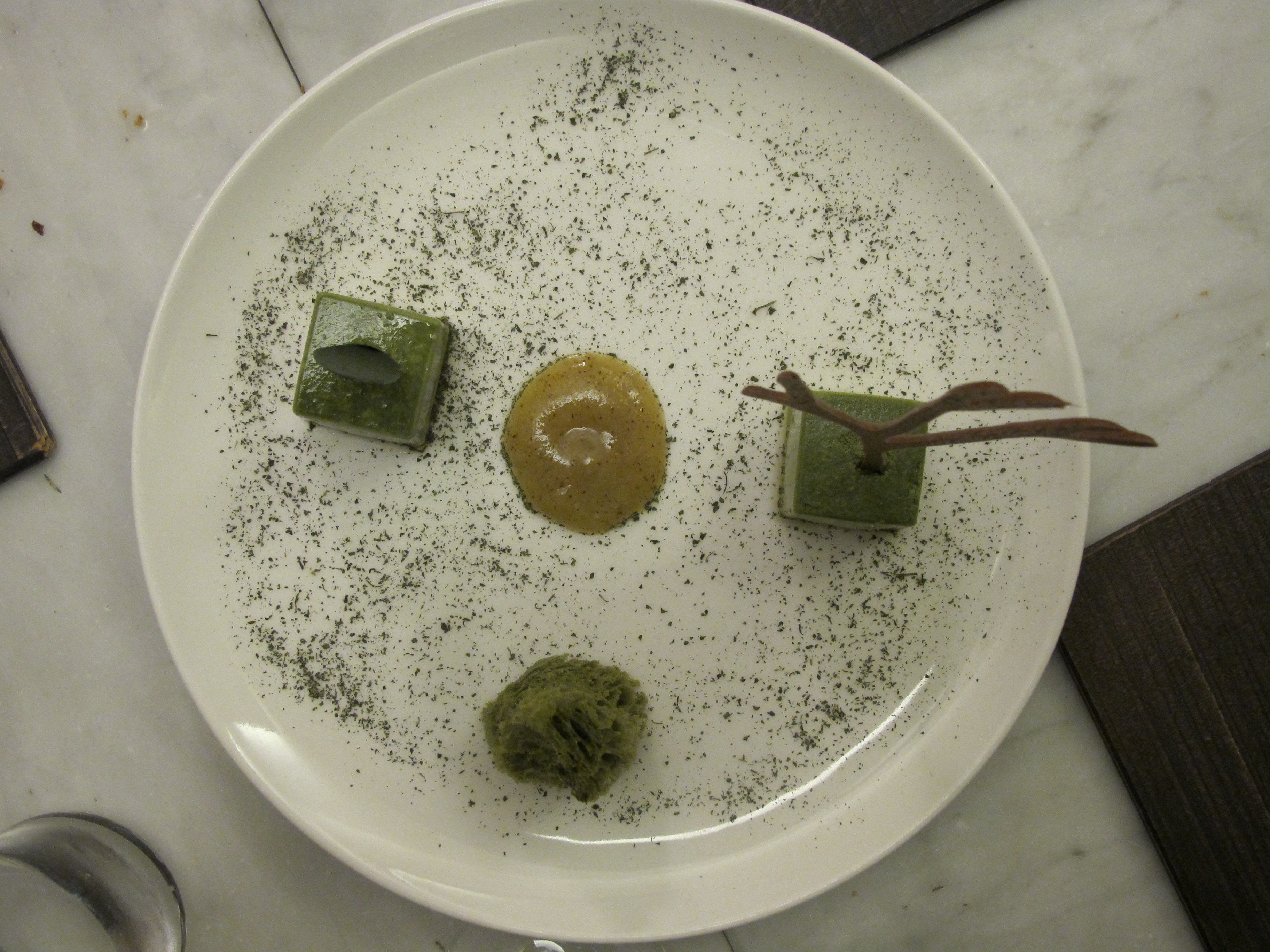 “Brown” was made with black garlic, savoiardi [biscuit], coffee, cocoa beans. We loved the coffee sauce, which was poured by the server.