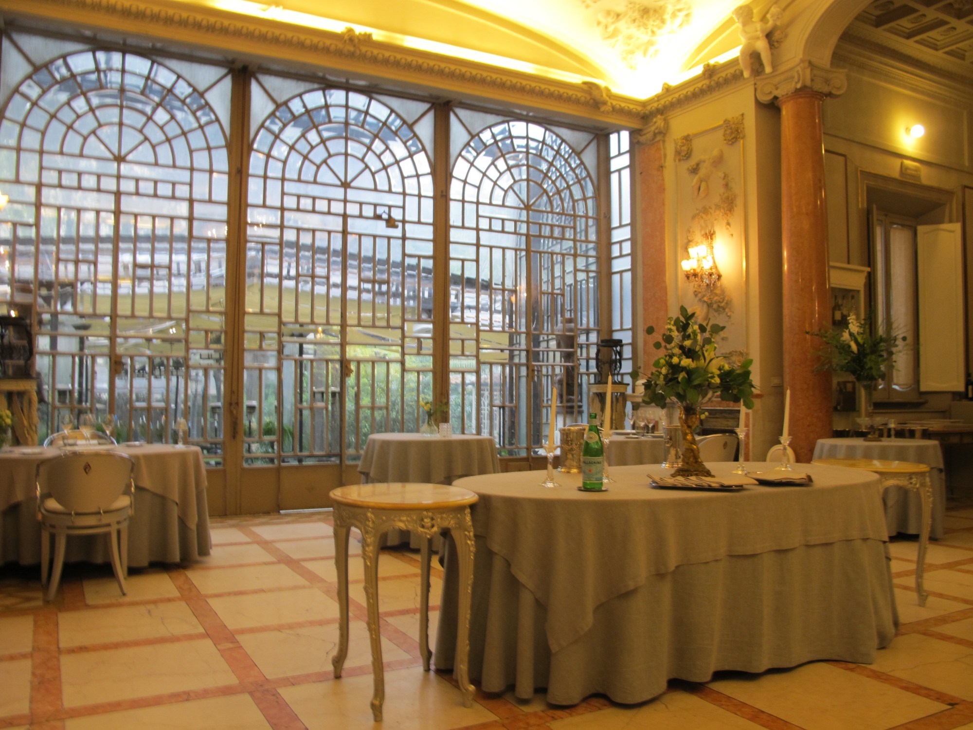 We enjoyed G&Ts in a little side room while waiting for Massimo to arrive. Service was very refined, yet friendly. Then we entered the lovely spacious dining room, which features an immense and ornate glass window. There were only a handful of other patrons that day, enjoying the very elegant, yet comfortable dining room. I believe there were two wait staff for three tables, so our service was always prompt, warm, and never intrusive.
