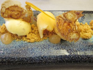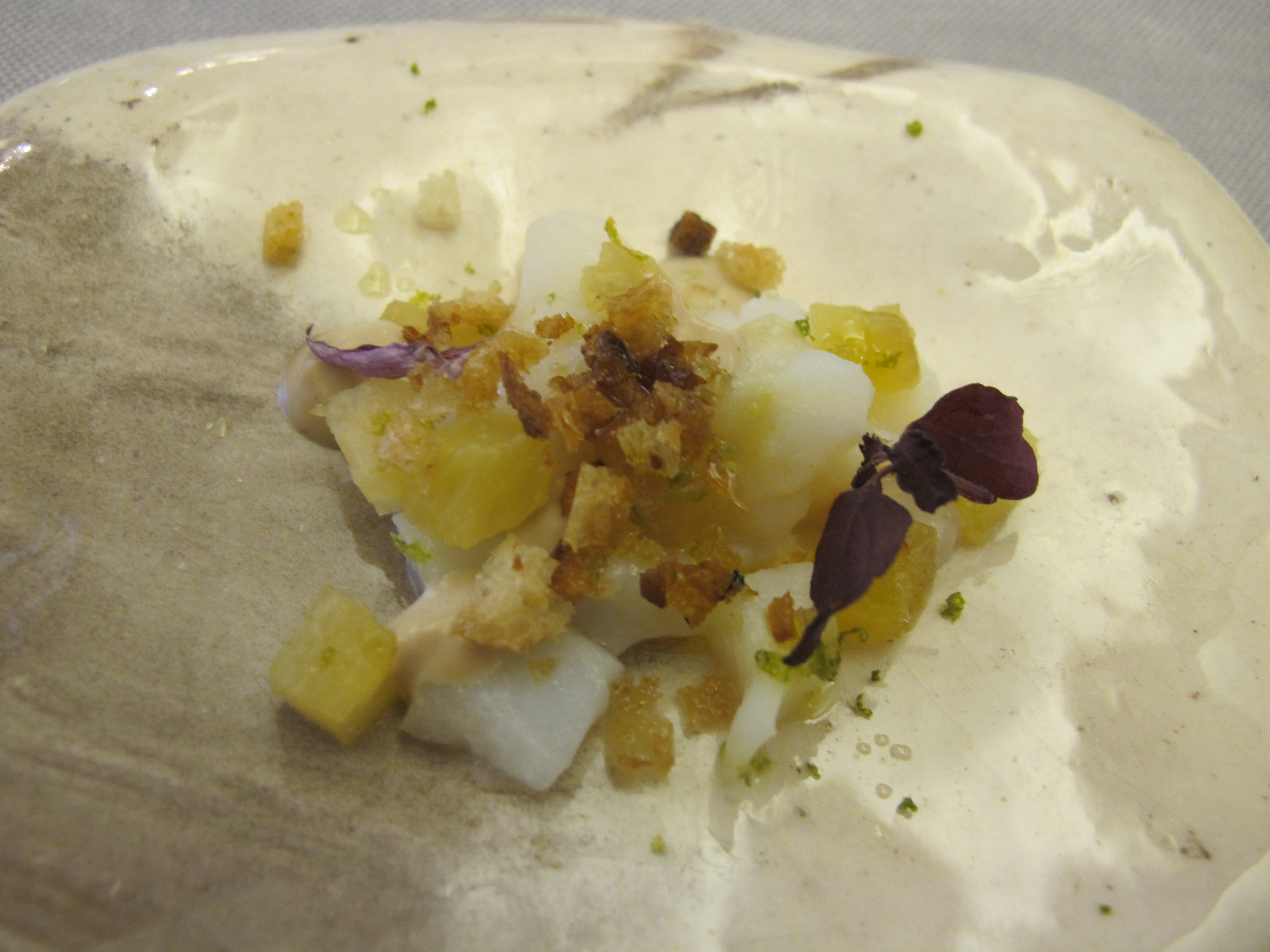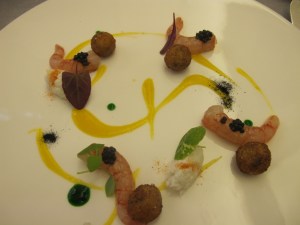 We began with wonderful, sweet red shrimp, bursting with flavor, with touches of cardamom, citrus, and mint croquettes.