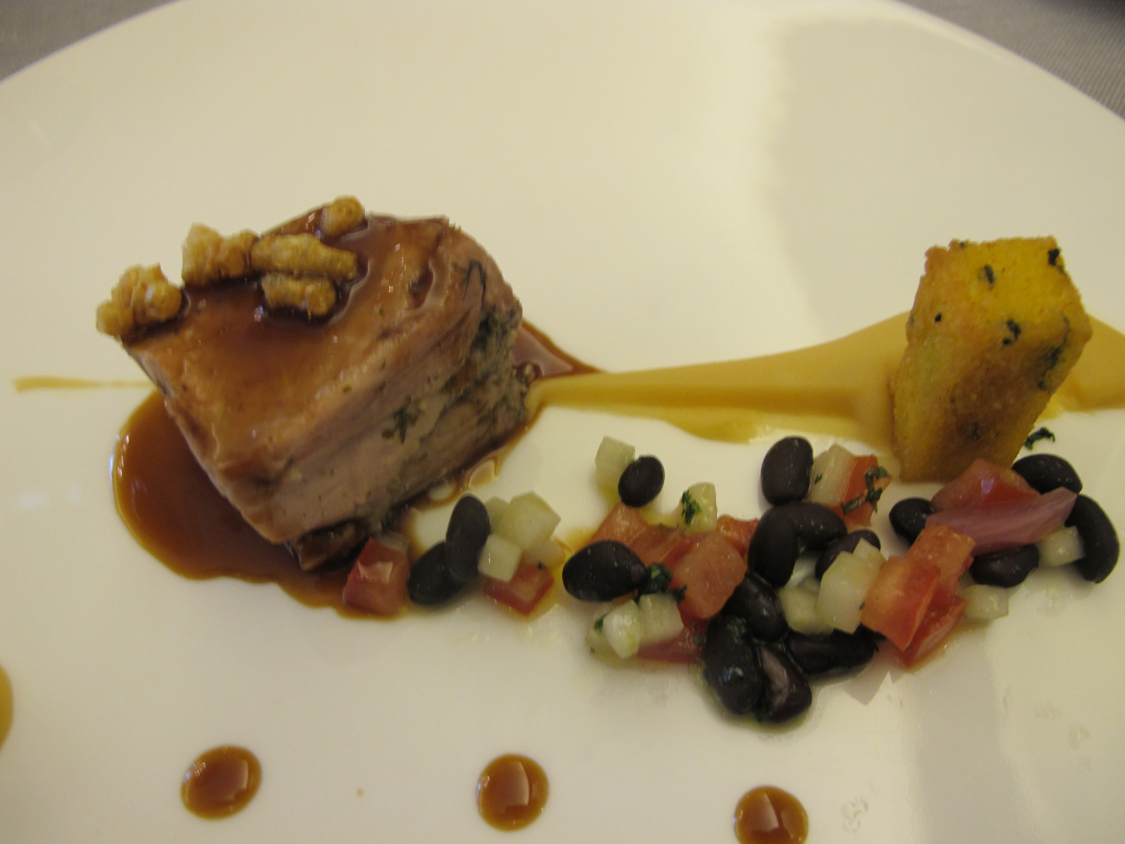 Our main course was piglet. Juicy and flavorful, with a Goldilocks-worthy amount of crispy skin, accompanied by black beans, vegetables, and cabbage. The proportions of flavor and texture on this plate were spot on.