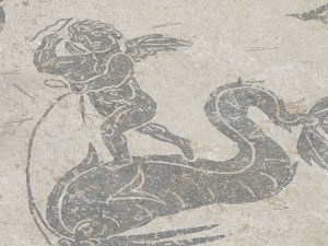 A putti rides a dolphin