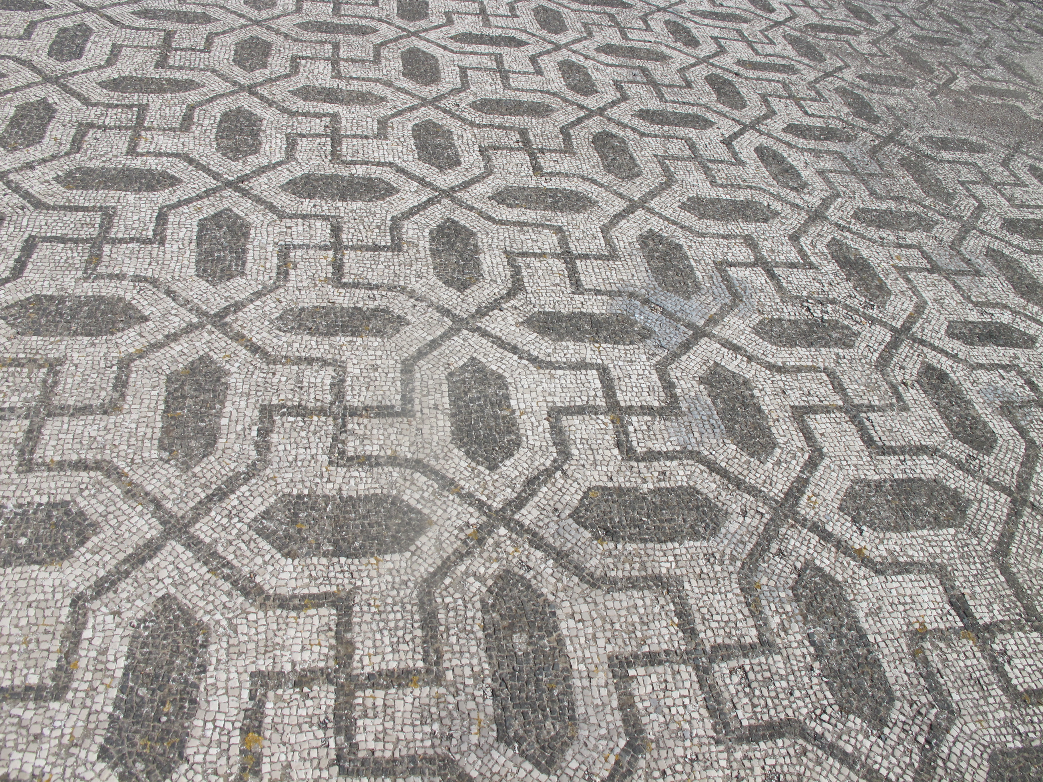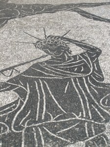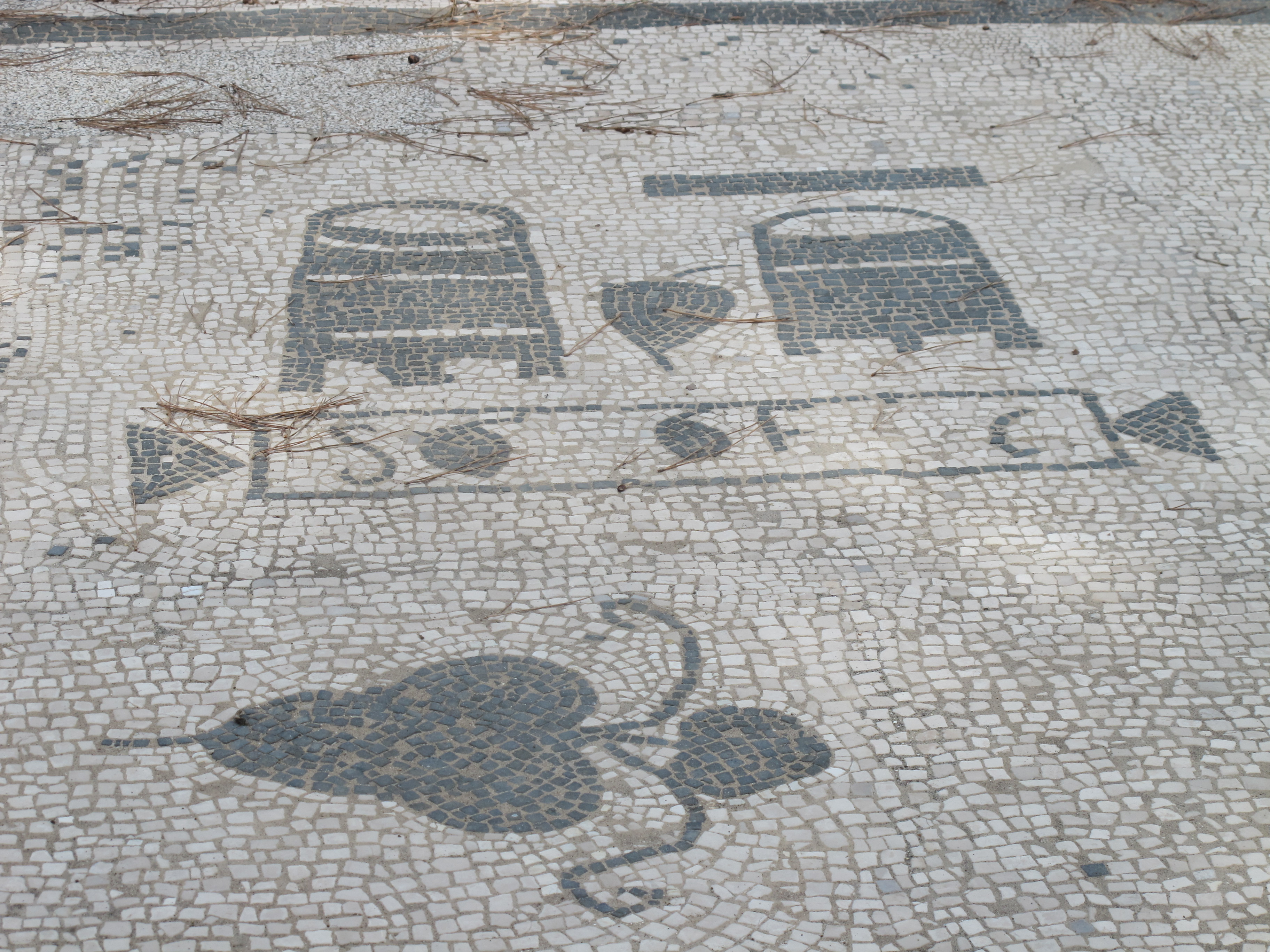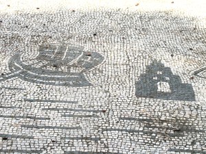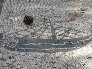 Mosaic of a ship – one of many at Ostia (and a pine cone from one of the umbrella pines)