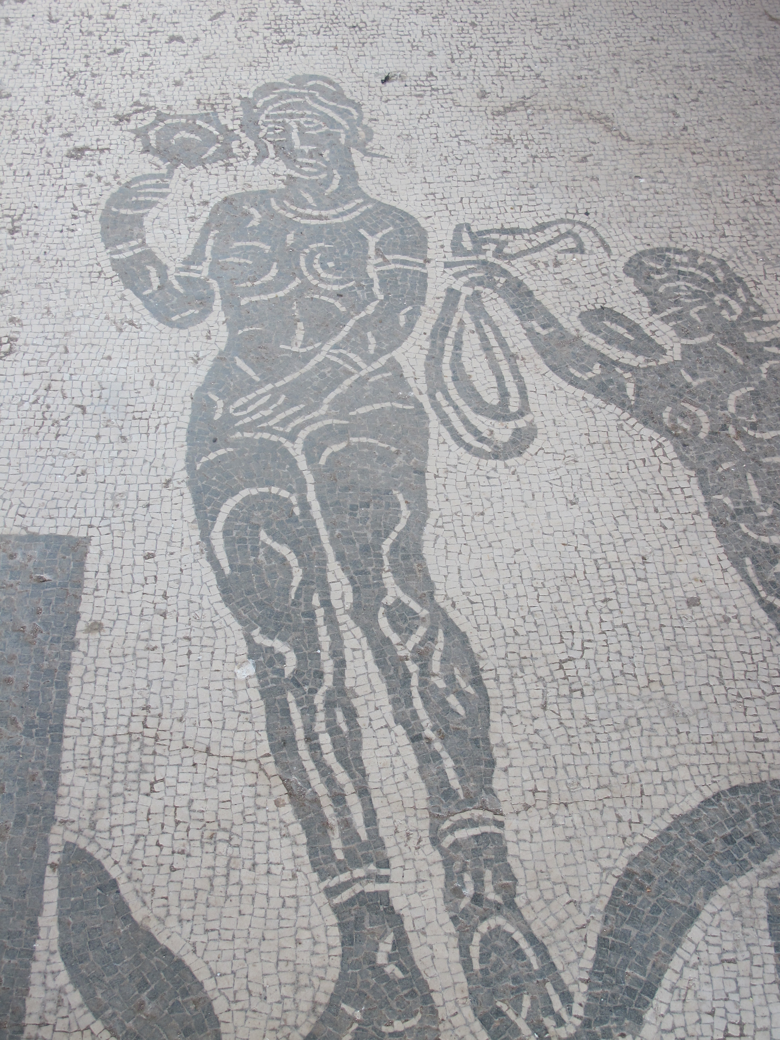 But it is not just the geometric pattern floors that are stunners. In Ostia Antica, you’ll find gods and goddesses, fanciful sea creatures, and celebrity boxers depicted for all eternity. In the photo at the top of this post, Neptune (holding his trident) rides through the sea drawn by galloping sea-horses, surrounded by mermen and sea creatures (that giant shrimp looks rather tasty). Appropriately enough, that mosaic graced a bathhouse.