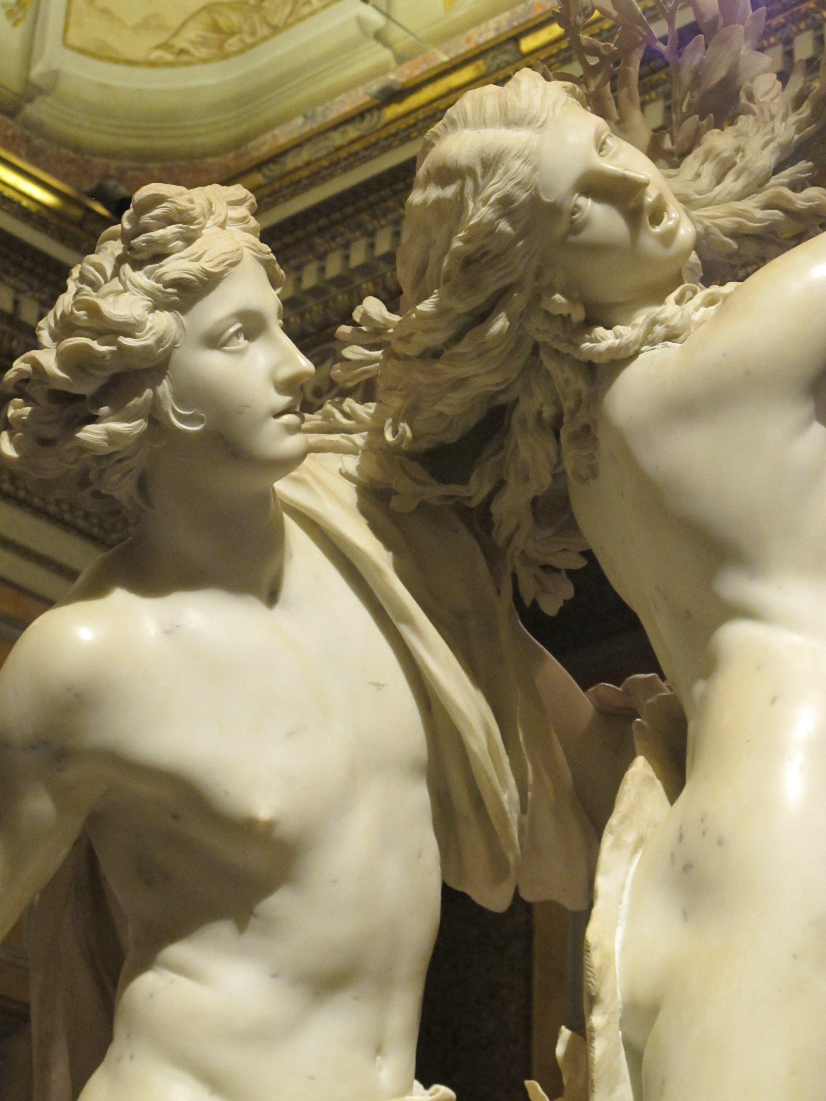 Bernini, however, made masterful use of the three-dimensionality of sculpture. As you move around the sculpture, the different viewing angles reveal different aspects of the scene. Being able to do this in a three-dimensional art form allowed Bernini to depict the physical force and speed of the two figures, and the sense of transformation.