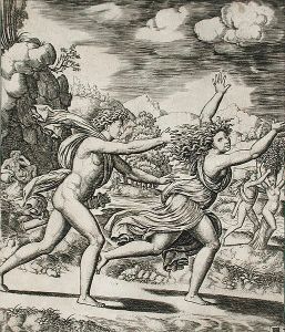 In this engraving, the artist has decided to try and depict the story in two separate stages. The main image is Daphne running, with no signs of transformation. Although it looks like she was trying for speed, holding her hands up in the air doesn’t seem like a good idea.