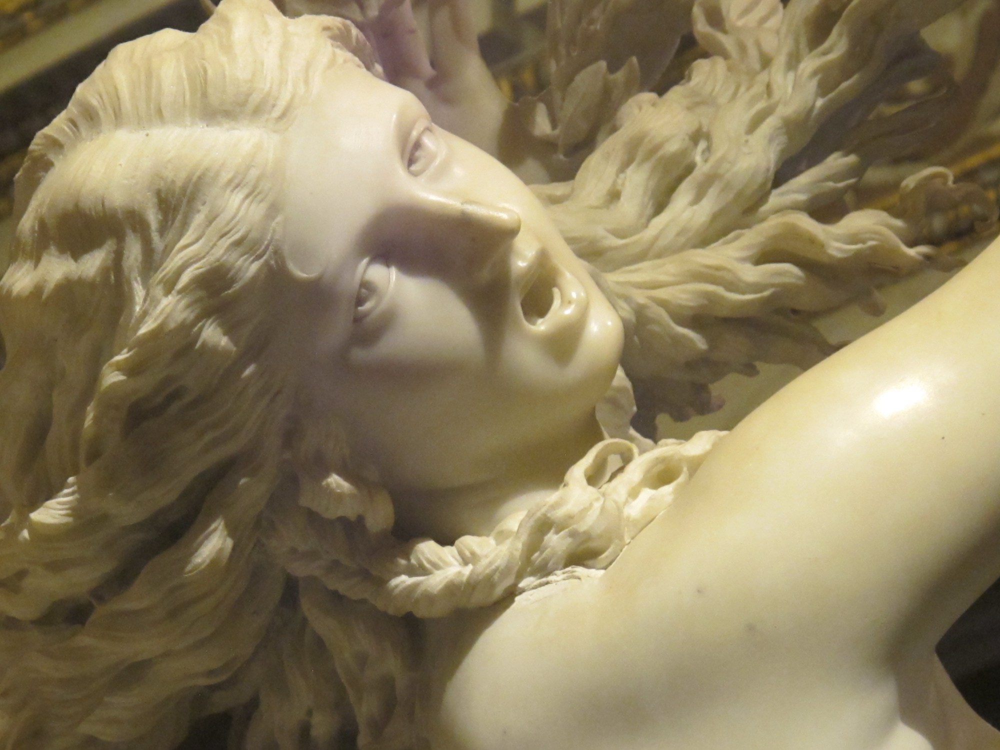 Viewing the sculptor from further back, you see Daphne is becoming a tree as she frantically throws herself forward, away from Apollo. Bernini portrays a split second in time: one thinks that in just a few seconds, Daphne’s body will have completely transformed, and the scene will be over.