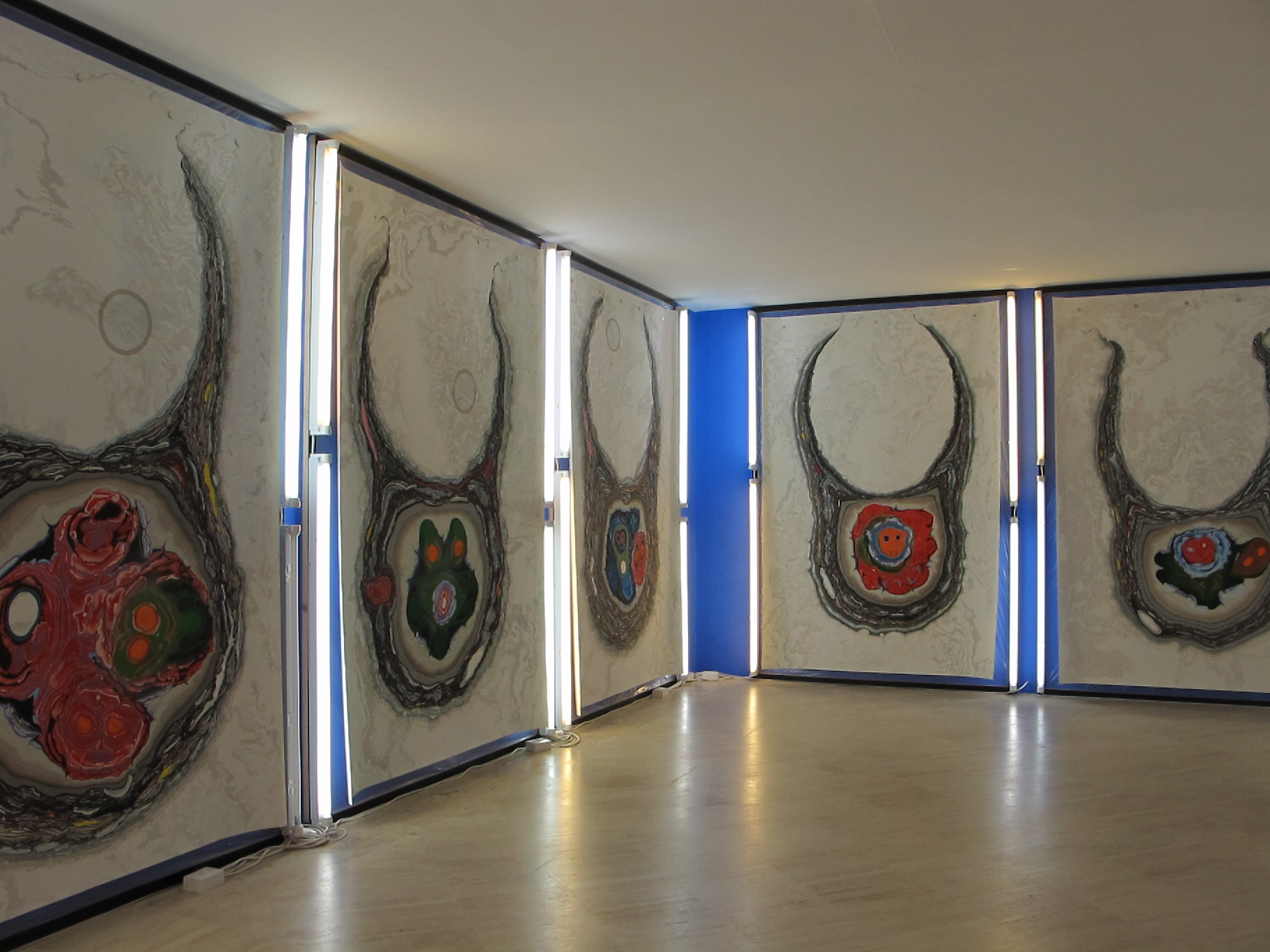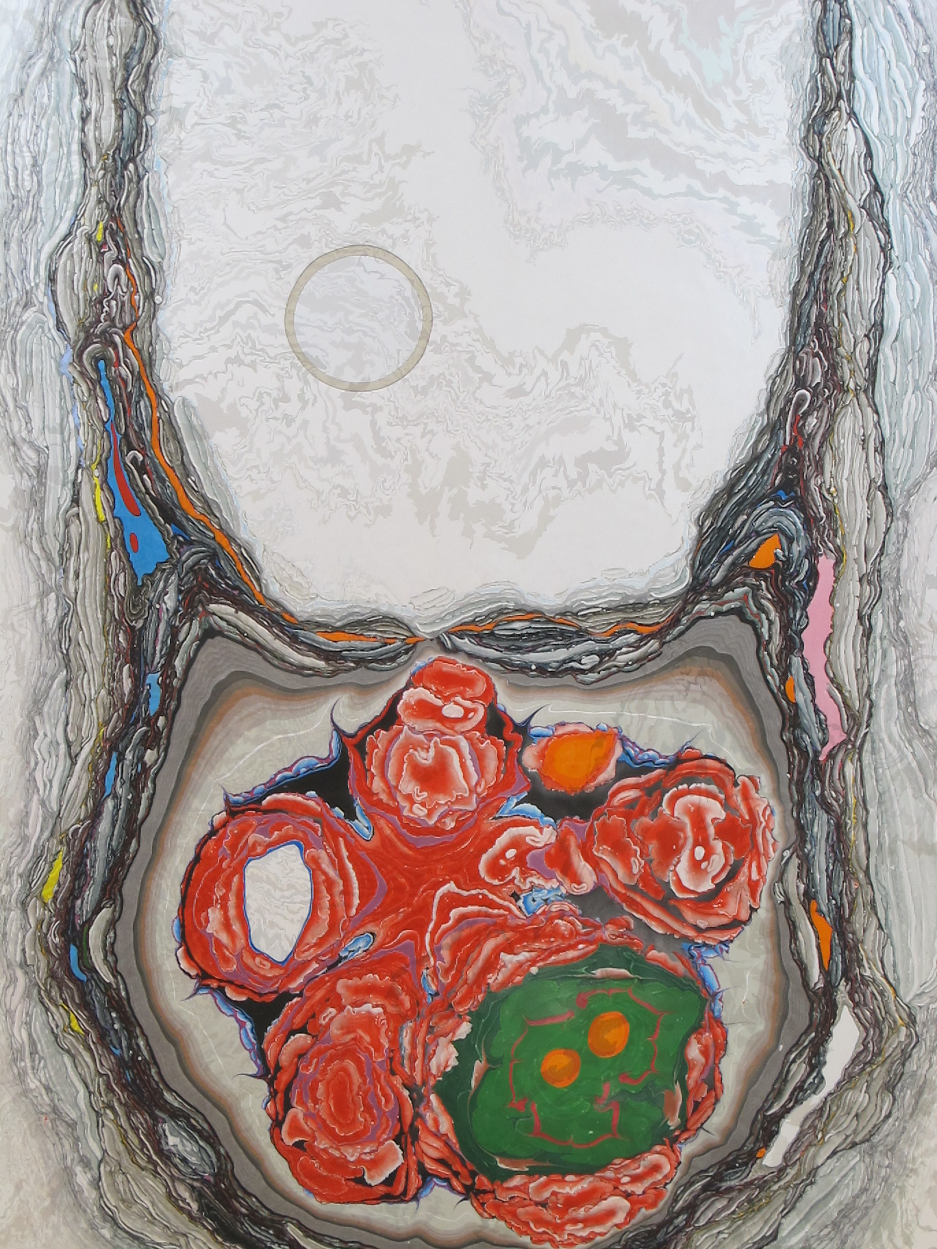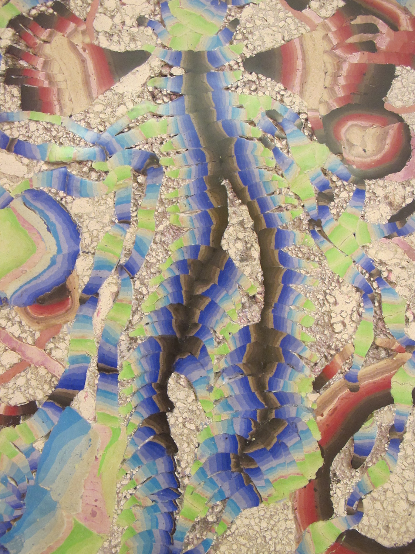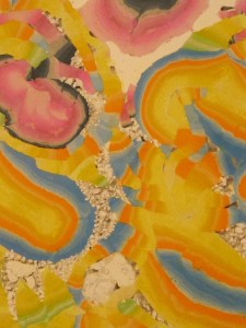 I found Ms. Brätsch’s works that used a marbling technique to be particularly interesting. When one does a close-up of these works, they are particularly gorgeous, like a colorful geode that has been cut open: