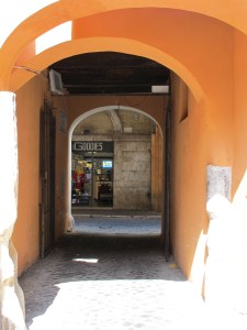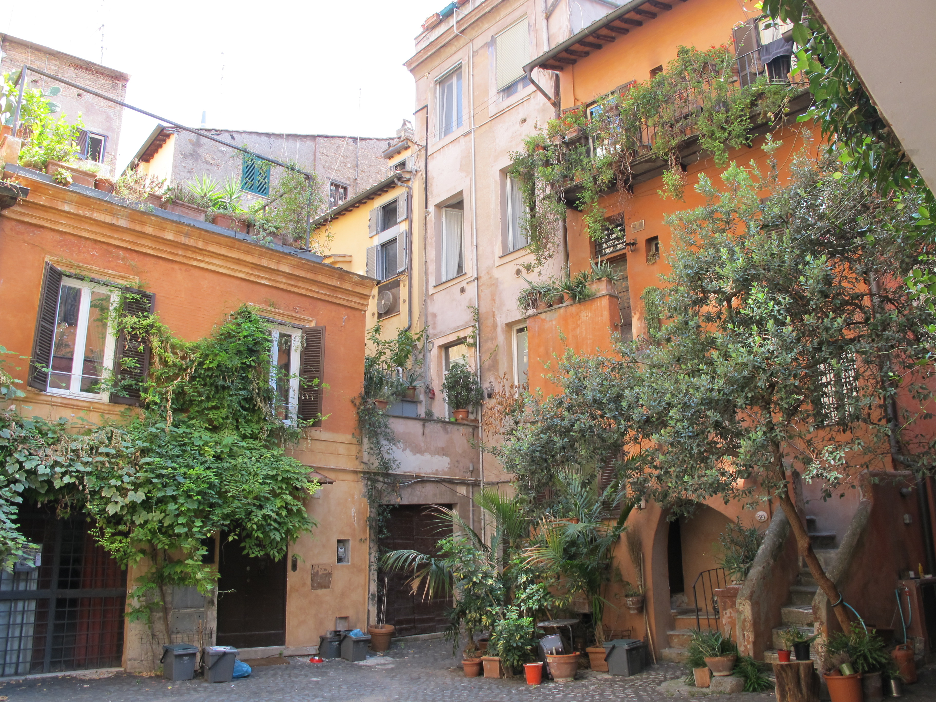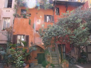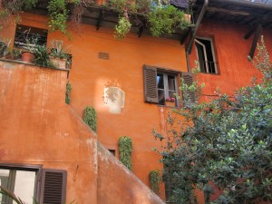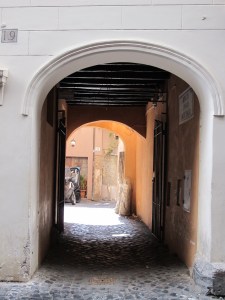 Walk through it if the gates are open. You arrive in a little courtyard, once home to the vinegar makers of Rome. It remains a cobblestone courtyard surrounded by private homes. Orange, red, and green is all around you.