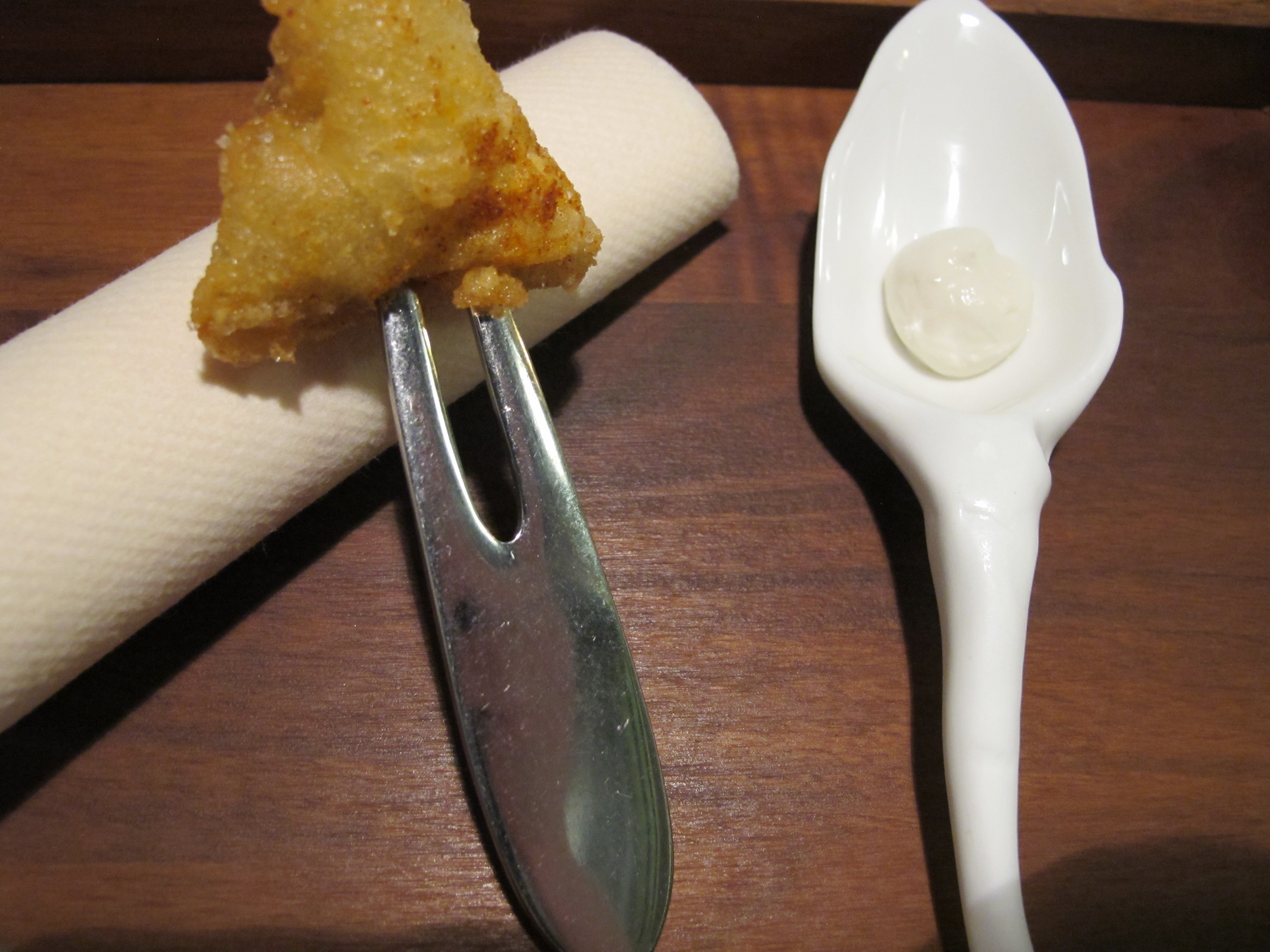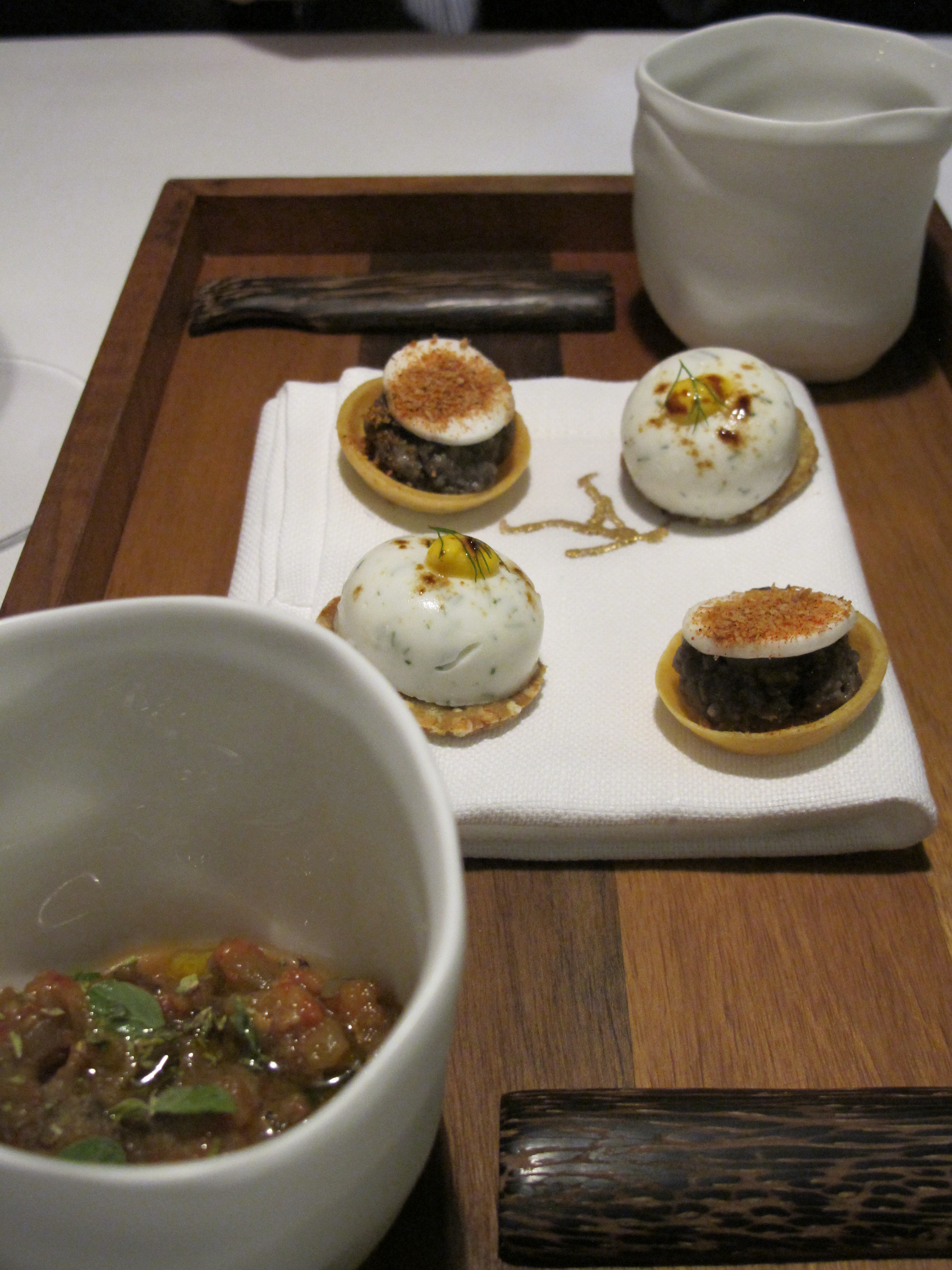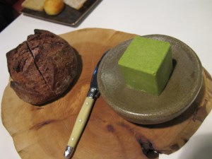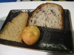 Then came three rounds of delightful amuse bouches. The mackerel with soy and miso in a tomato soup was elegant (pictured at the top of this post). The flavorful accompanying bread was a perfect balance of crust and doughiness.