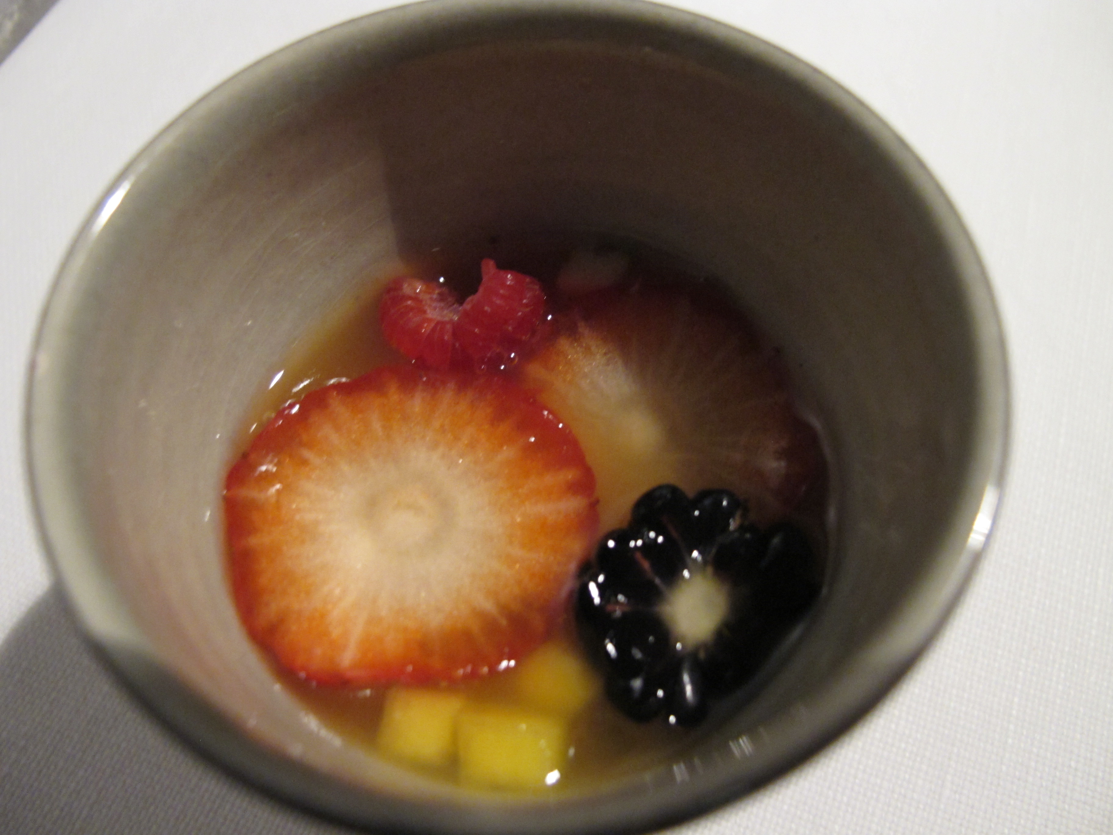Following the Italian tradition of respecting the current season, the meal was wondrously full of late summer Italian flavors and textures. It started with a refreshing drink of green tea with summer fruit (balancing a starting sweet against the dessert finale?).