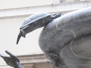 Frankly, who cares who made them: they transform the fountain into something that’s simultaneously charismatic and whimsical. Now, the four youths are boosting some squirming bronze turtles into the top basin. You can picture the turtles’ back legs moving as they try to push themselves up, and the hands of the youths giving the turtles a much-appreciated push.