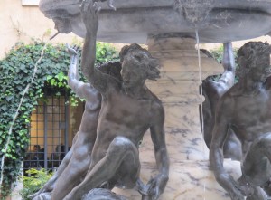 The human figures are based on the classical Greek sculptures of youths, known as ephebes, and were made by the sculptor Taddeo Landini. The youths stand on somewhat weird, stylized dolphins (a favorite figure on many Roman fountains).