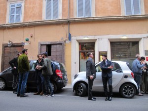 The place was packed. I struggled to get to the bar to order two glasses of wine, struggled again through the crowd to get to the front door, and then sat with Laura on one of the front steps among the throng at the entrance with a friendly dog. The benches on both sides of the entrance and the steps were filled, and people had spilled out into the street, sometimes using the cars to rest their glass of wine.