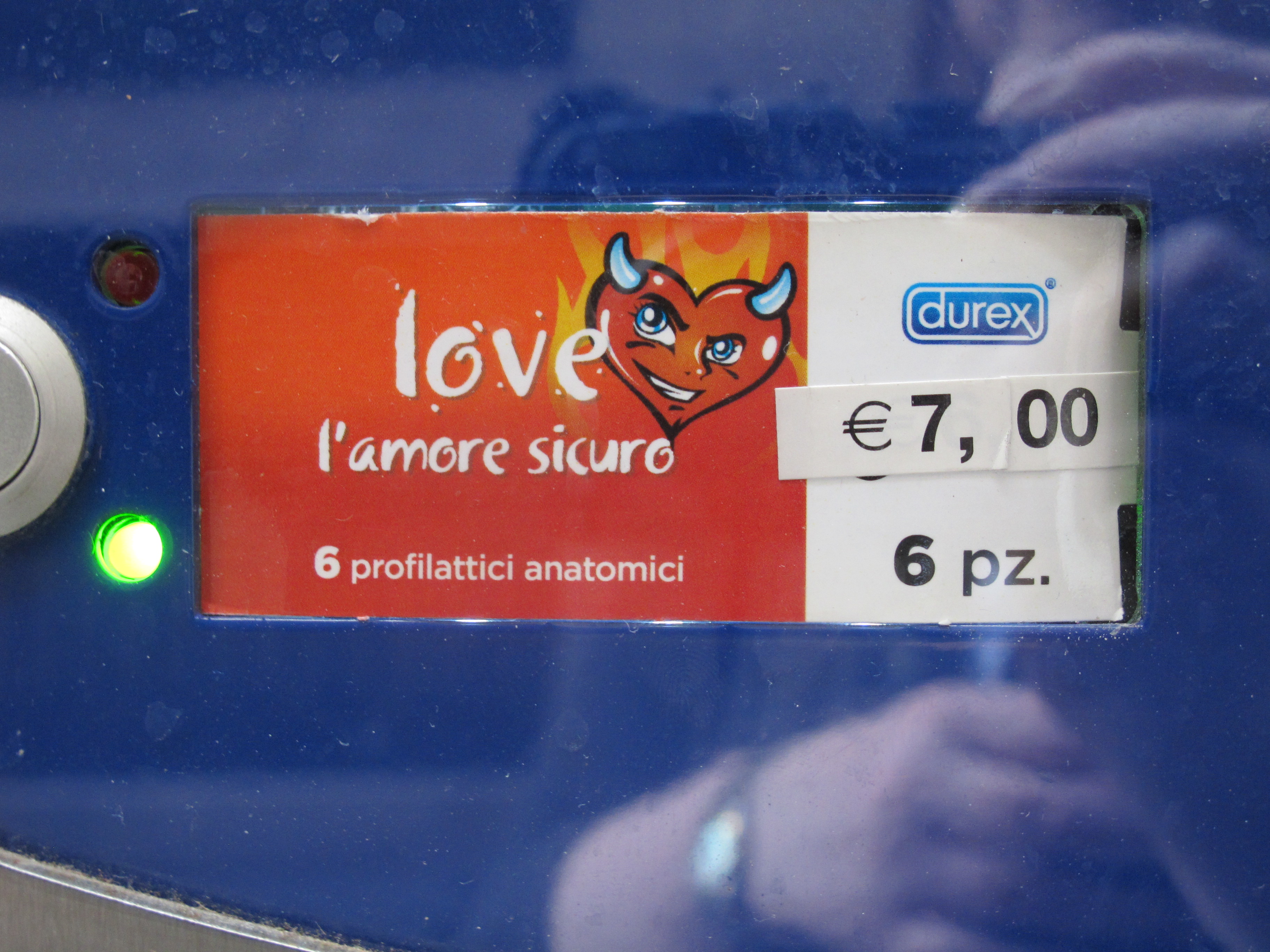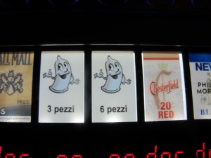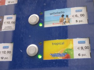 But there’s more. Around the corner, across from the back of a church, is the condom vending machine, which gives you a number of selections.