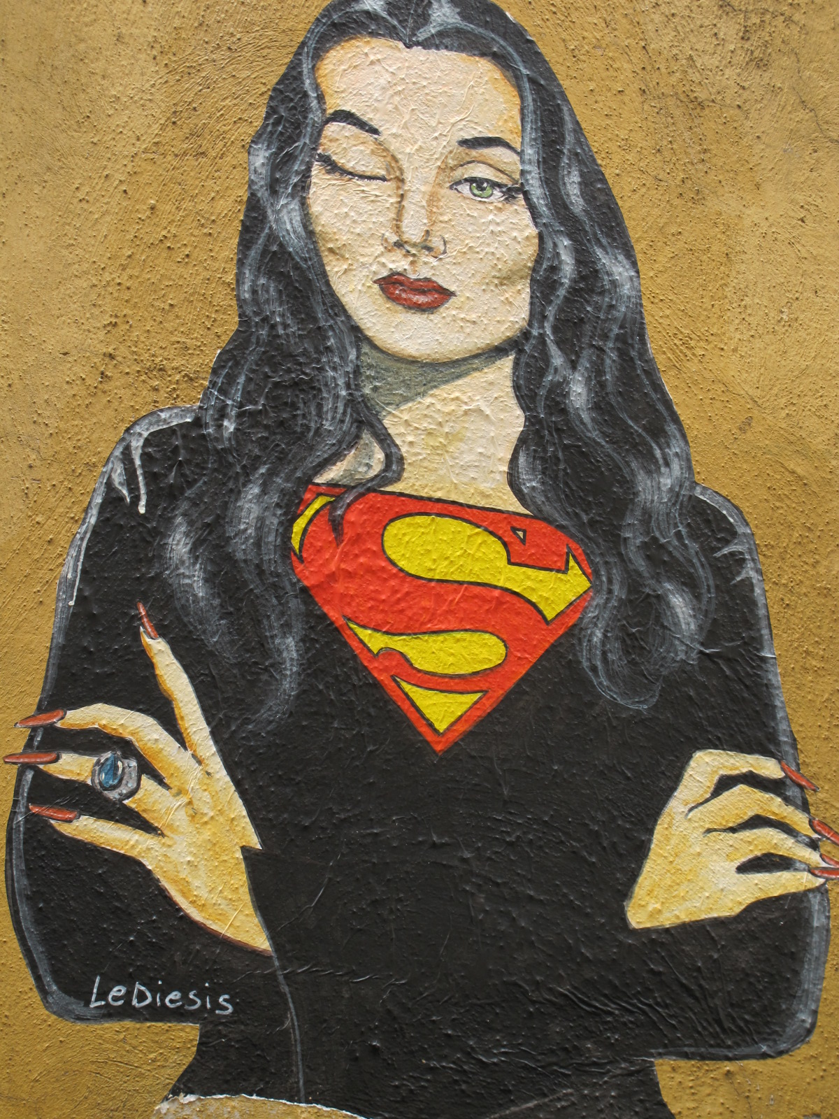 I particularly loved the friendly “Super Nonna” leaning out of a window at the top of this post, by the relatively new street artist LeDiesis. A short time later I found another one of his works, looks like Super Morticia of the Adams Family.