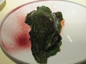 Laura’s lamb dish came “two ways” — both delicious. One serving was with a light cumin yoghurt sauce (perhaps influenced by the chef’s time in India) and Swiss chard (again, my photo does not do it justice).