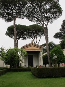 The villa has multiple courtyards and interior gardens, including one with a small reproduction of an Etruscan temple, surrounded by a few lovely umbrella pines.