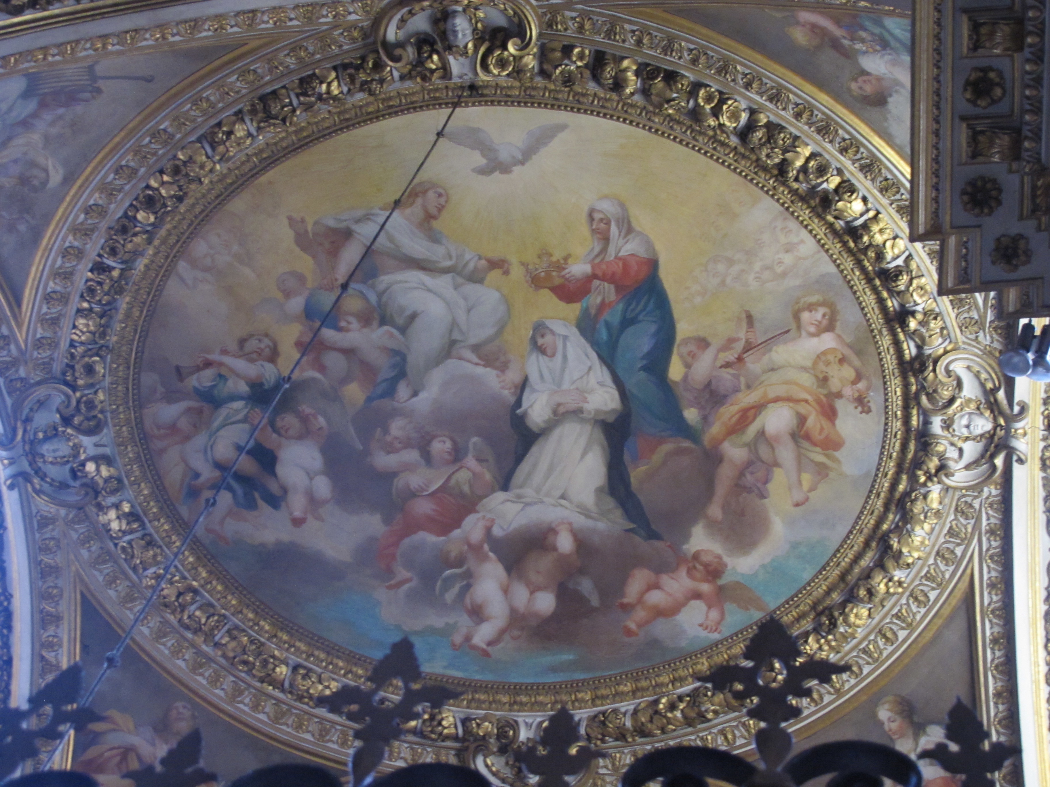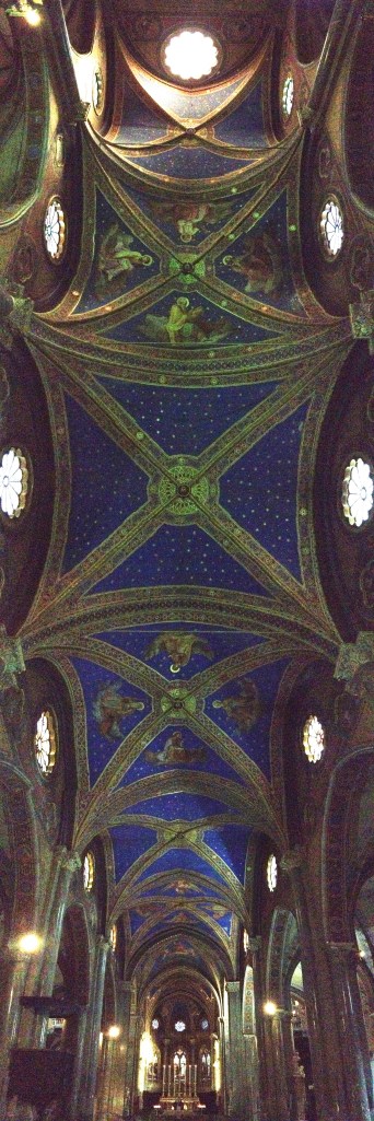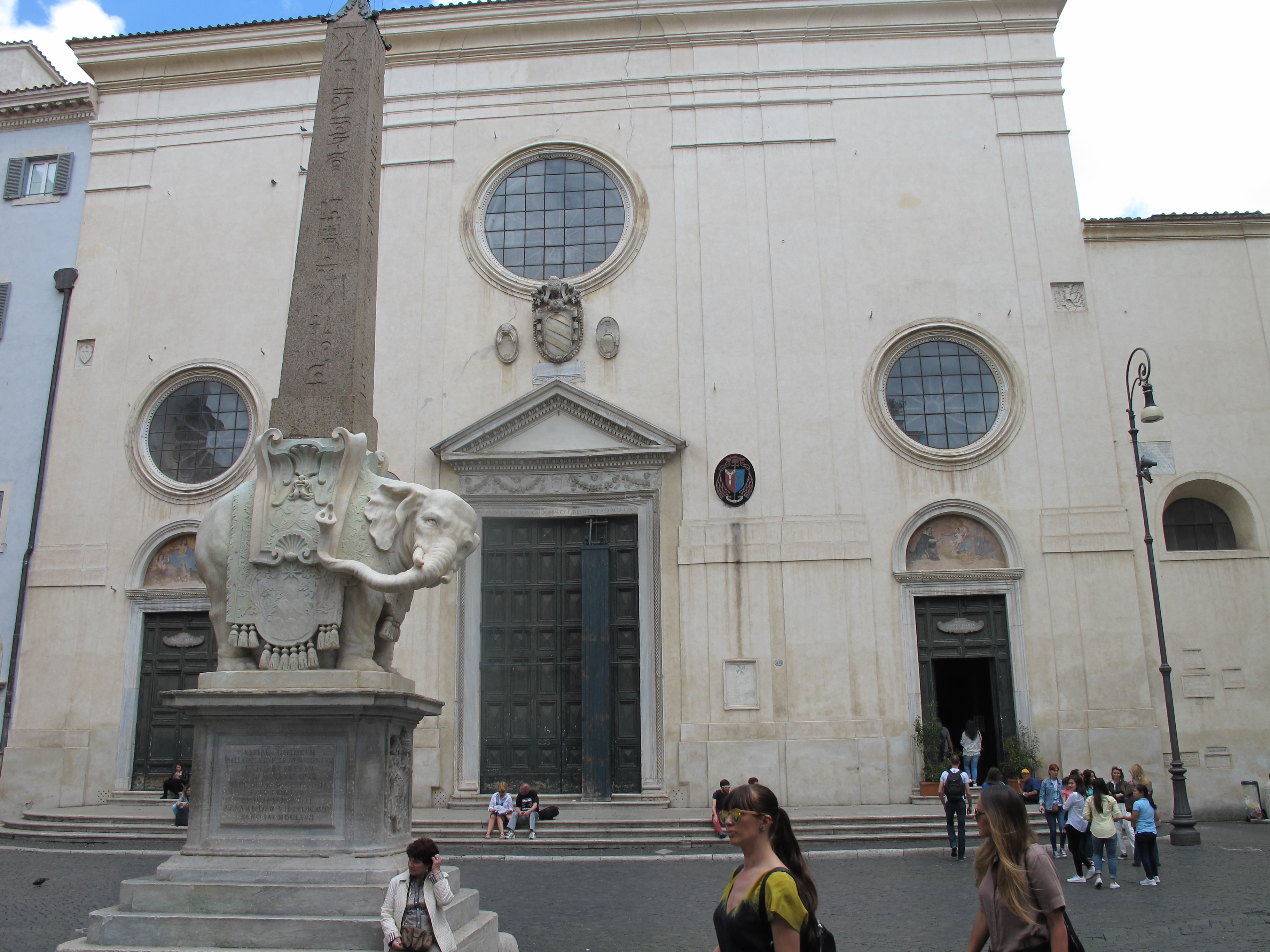 If you’ve followed our blog for a while, you know I love Roman floors. But I also love all the magnificent blue ceilings in Rome, one of which I noted in our last post. My favorite blue ceiling, however, is located in a church behind the Pantheon, and behind the wonderful little elephant carrying an obelisk on his back (“Minerva’s Chick“), by Bernini.