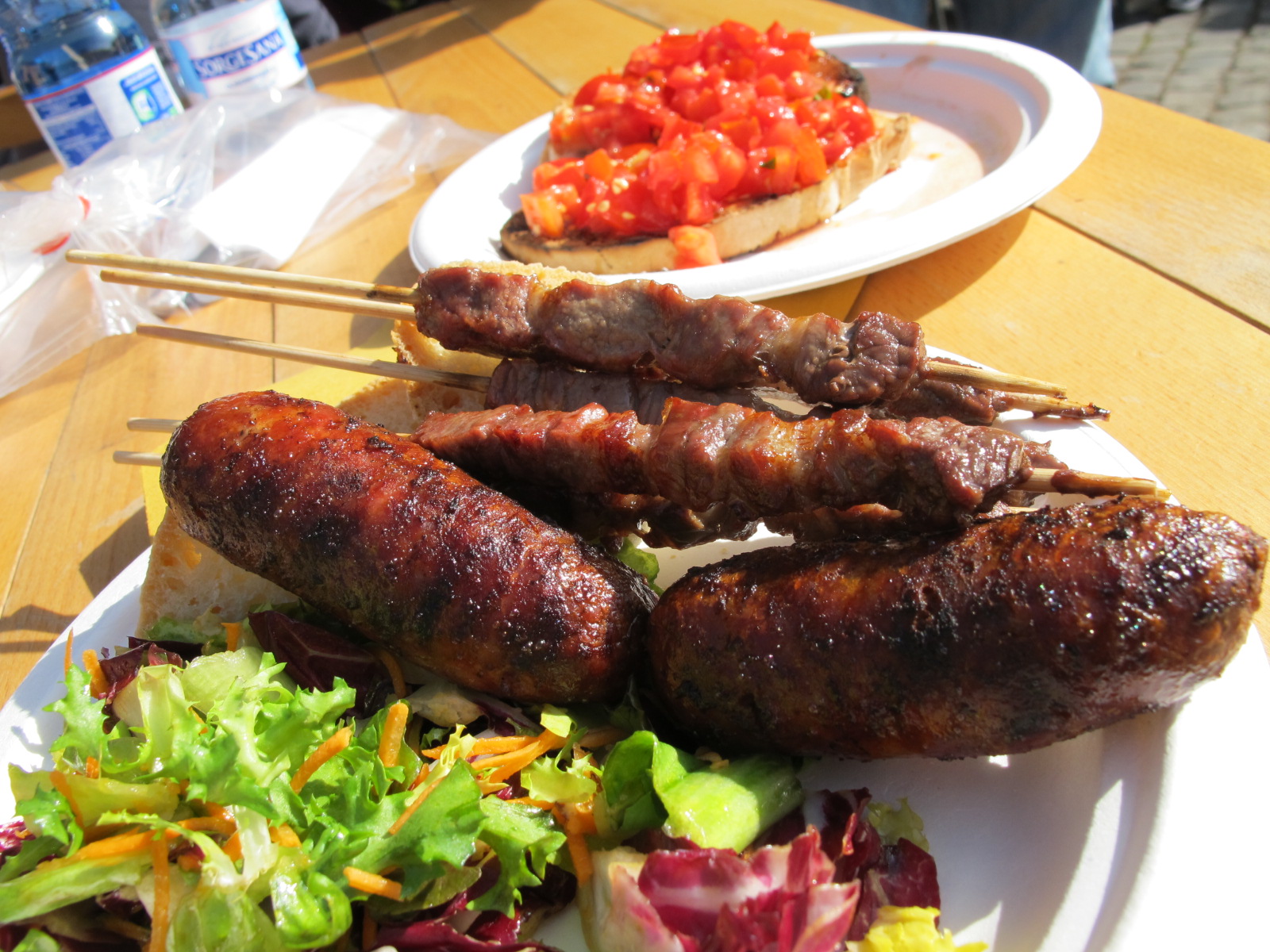 The foot traffic within the market is supposed to be one-way due to COVID (we started off the wrong way, but no one gave us the stink eye), and people were masking and being mindful of distance, for the most part. After perusing the stalls, we were eager to head to the garden courtyard in the back. From here, if you stand up tall and peer over some plants, you can get a view of the Arch of Janus. The smell of grilled meats immediately drew us in. We ended up with platters of salad, fresh tomato bruschetta, sausage, and skewered lamb, all very affordable and very delicious.