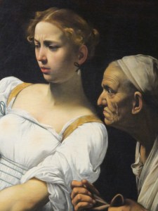 One thing I love about Caravaggio is he wasn’t afraid to make women both strong and feminine (Michelangelo could have taken a lesson from Caravaggio on this latter point). This is a beautiful yet fearsome Judith. Although her brow is slightly furrowed, she does not exhibit a twinge of remorse as she slices the throat of Holofernes, the blood spurting from his neck, his mouth open in a scream. It’s violent and sensual at the same time. The sensuality is not just Judith’s beauty but also Holofernes’ strong, naked body — we know she’s just seduced him a few minutes earlier as part of her assassination plan. It’s a powerful and disturbing painting.