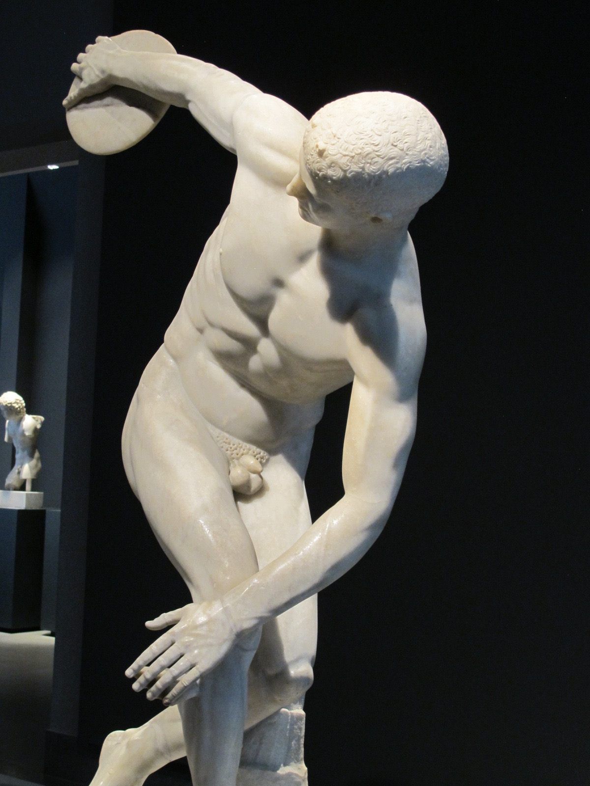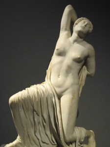 There are also sculptures that those who have studied ancient art may know well. This one depicts one of the daughters of Niobe. The daughter is dying from an arrow wound in her back. The myth is that her mother bragged about having more children than the goddess Leto. As punishment, Leto’s children, Apollo and Artemis, shot Niobe’s daughter, which we see here.