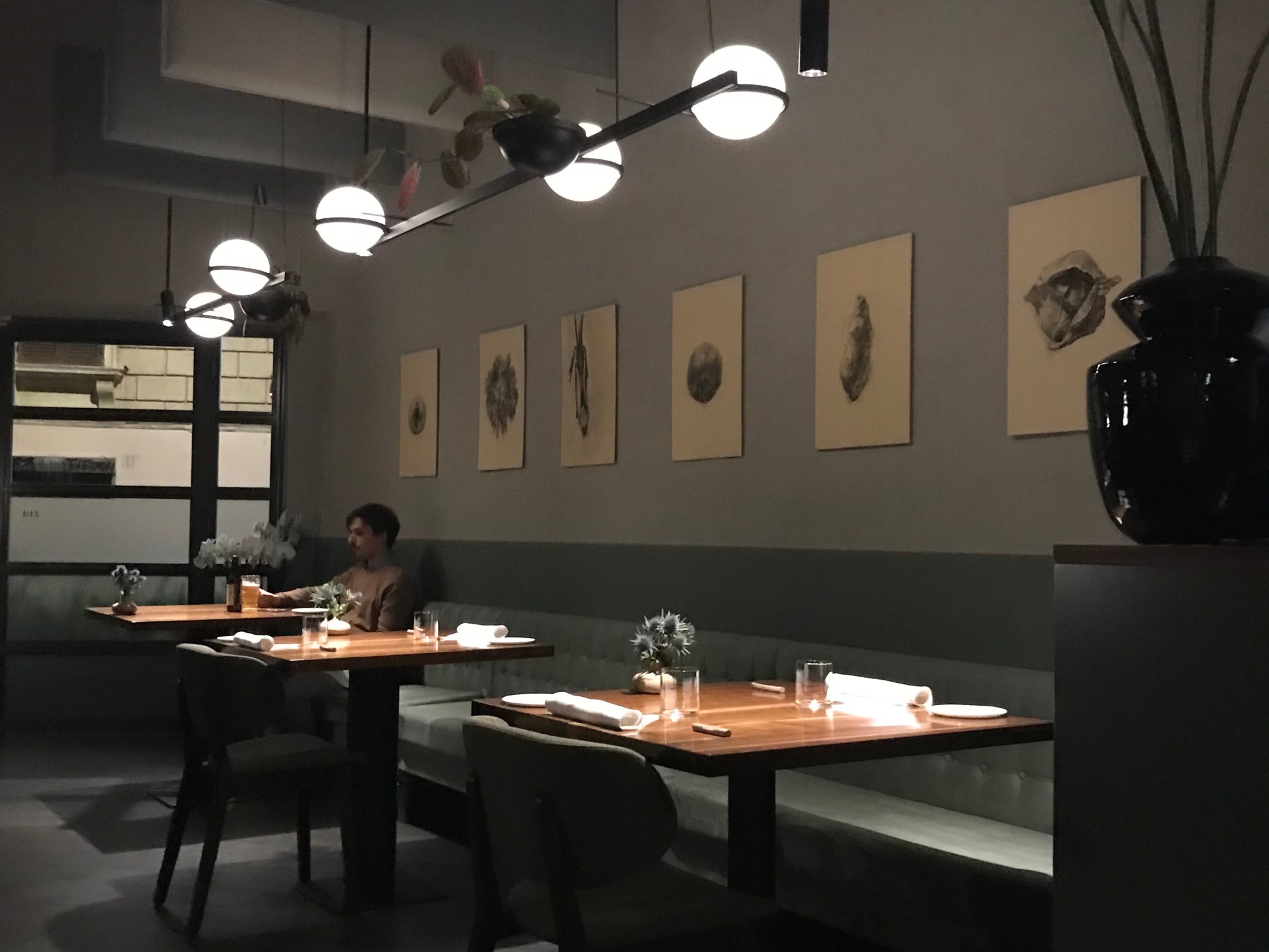 The service was friendly, well paced, and refined. The food was elegant, playful, and delicious. We had two cocktails, three glasses of wine, sparkling water, two teas, two pastas, one main, and one dessert. The entire bill was approximately 165 euros. Money well spent for a soothing, lovely experience. And, thanks to our careful ordering, we didn’t leave with the gluttonous groaning of over-stuffed bellies.