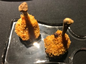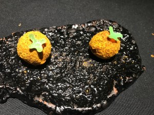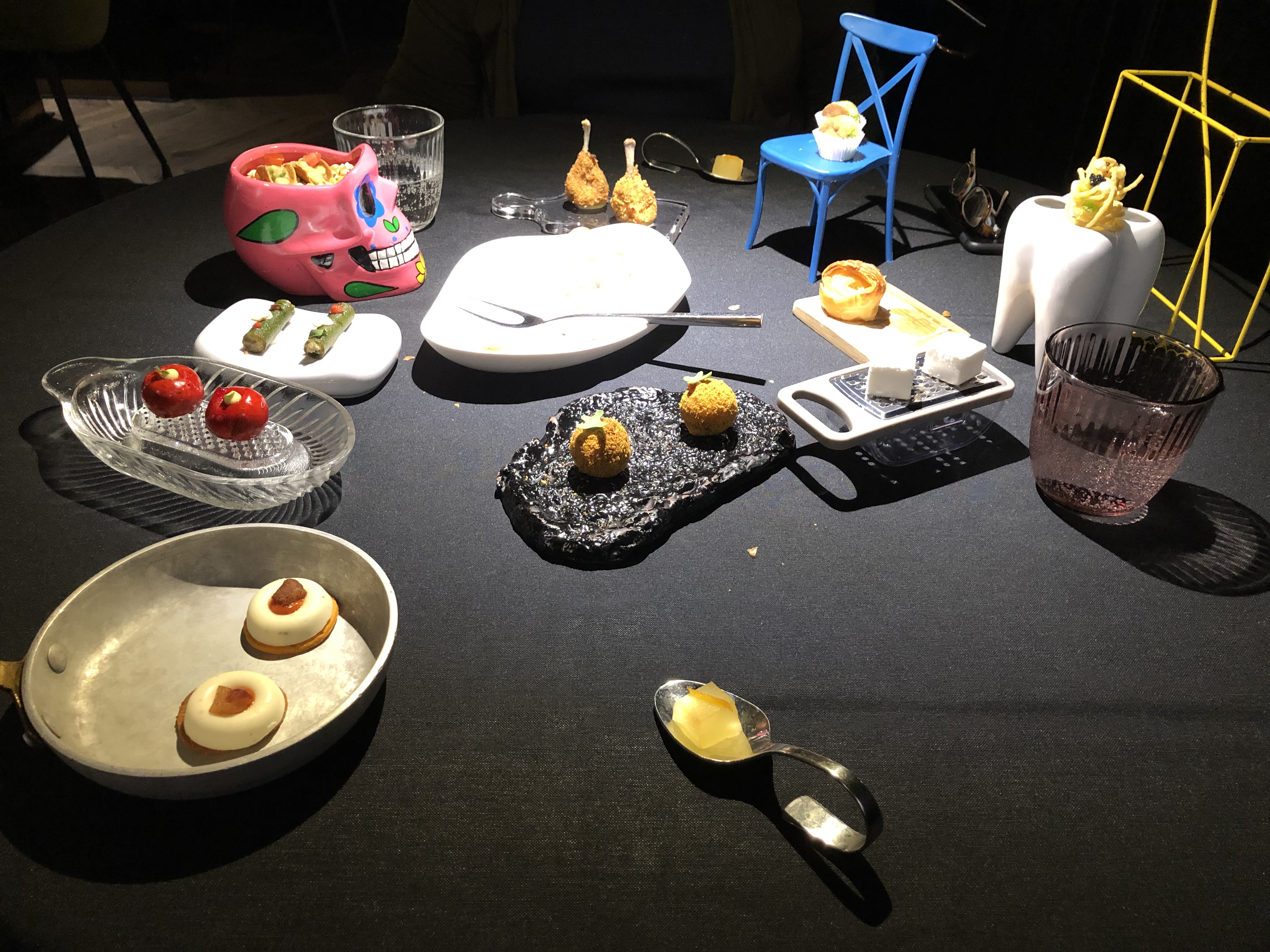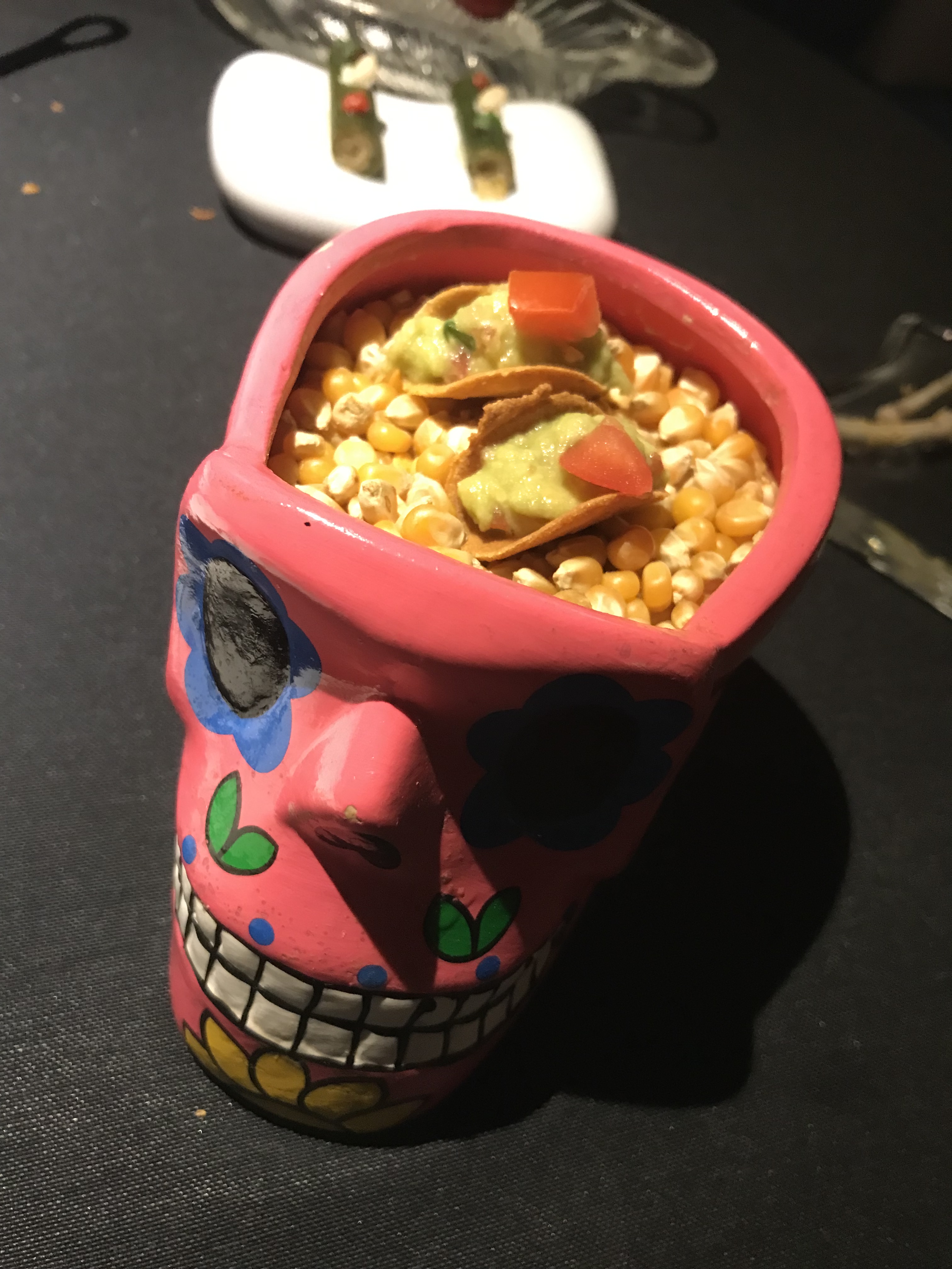 A boatload of amuse-bouches arrived shortly just as we finished the meats. The chef was clearly having a good chuckle. While some treats arrived on plates or in a spoon, others arrived sitting on a little chair, in a Mexican painted skull, on a cheese grater, or on a giant tooth… what I’d describe as spiritoso.