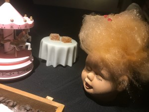 …. but we really didn’t need it because of the arrival of, you guessed it, Boatload #2 of treats. Boatload #2 consisted of piña colada orbs on ceramic cacti, yummy creamy “peanuts” served on a half of a green glass bottle, little savory sandwiches on a toy carousel, gelatinous bites on a ceramic table, and cotton candy that formed the hair on a creepy doll head.